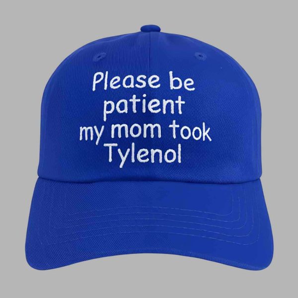 The bold embroidered text “Please be patient my mom took Tylenol” is stitched across the front in crisp white, creating a standout look against the vibrant blue fabric. The embroidery is detailed and long-lasting, designed to keep its sharpness over time without fading.