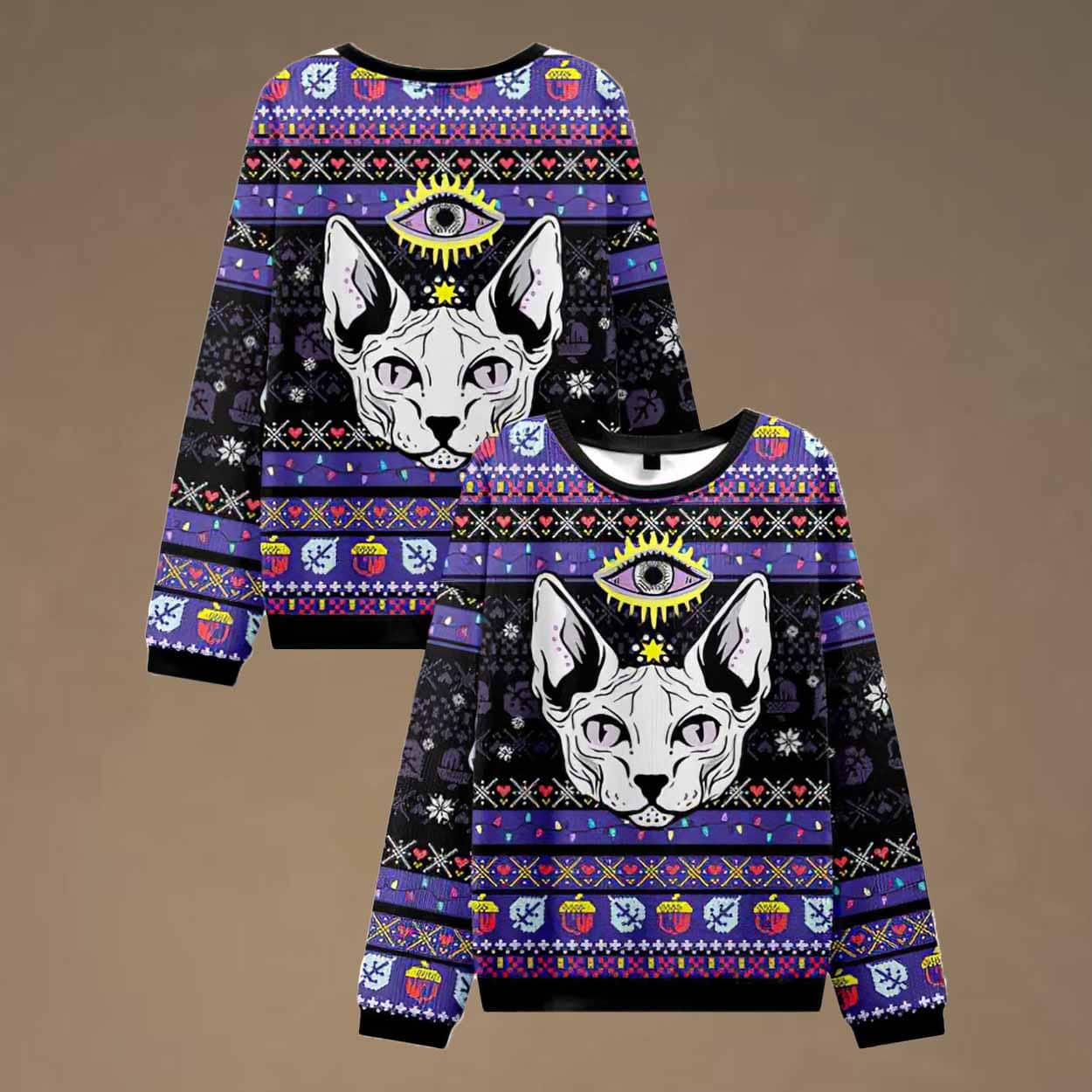 The ugly christmas sweater is made from a high-quality blend of materials, ensuring warmth and comfort throughout the winter season. The soft fabric is perfect for layering or wearing on its own, making it a versatile option for holiday celebrations. The bold, eye-catching design showcases a mystical cat adorned with an all-seeing eye, surrounded by a festive array of colorful patterns that evoke a magical and otherworldly vibe.
