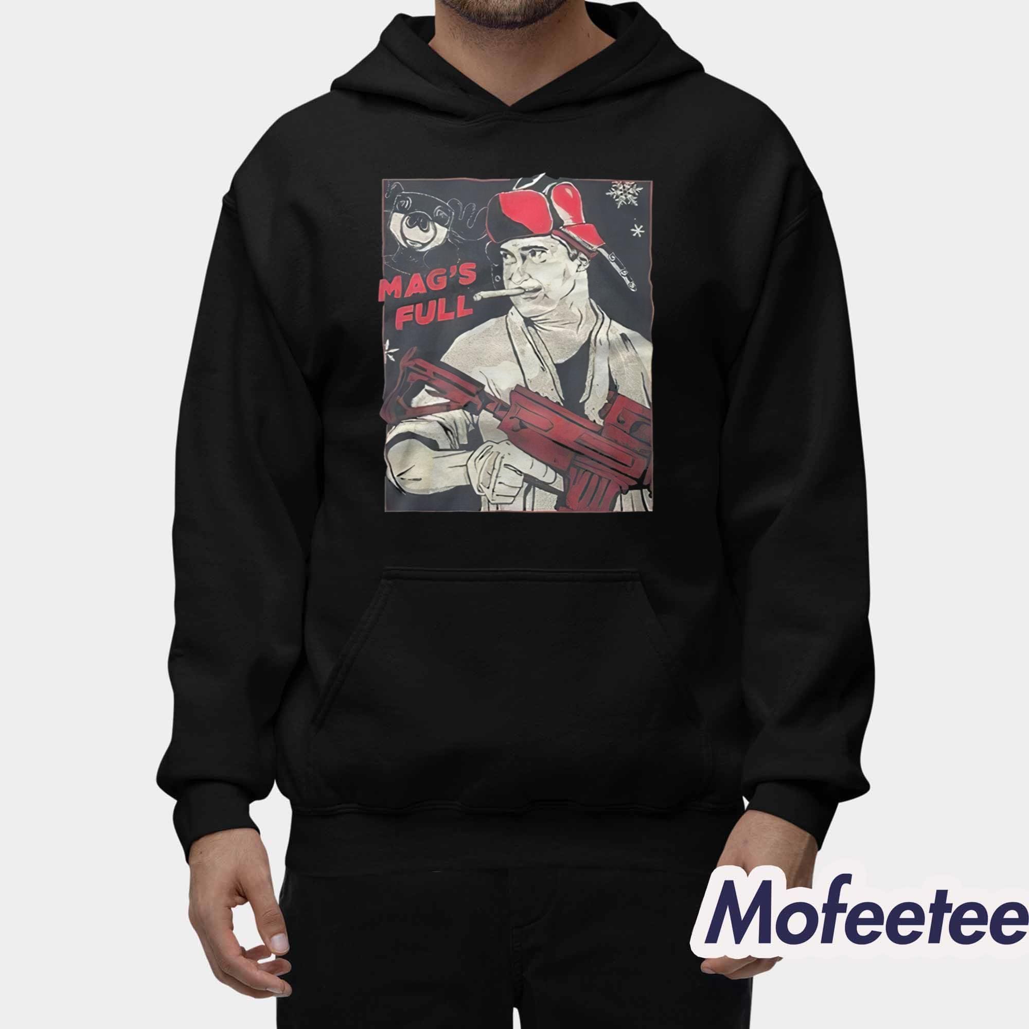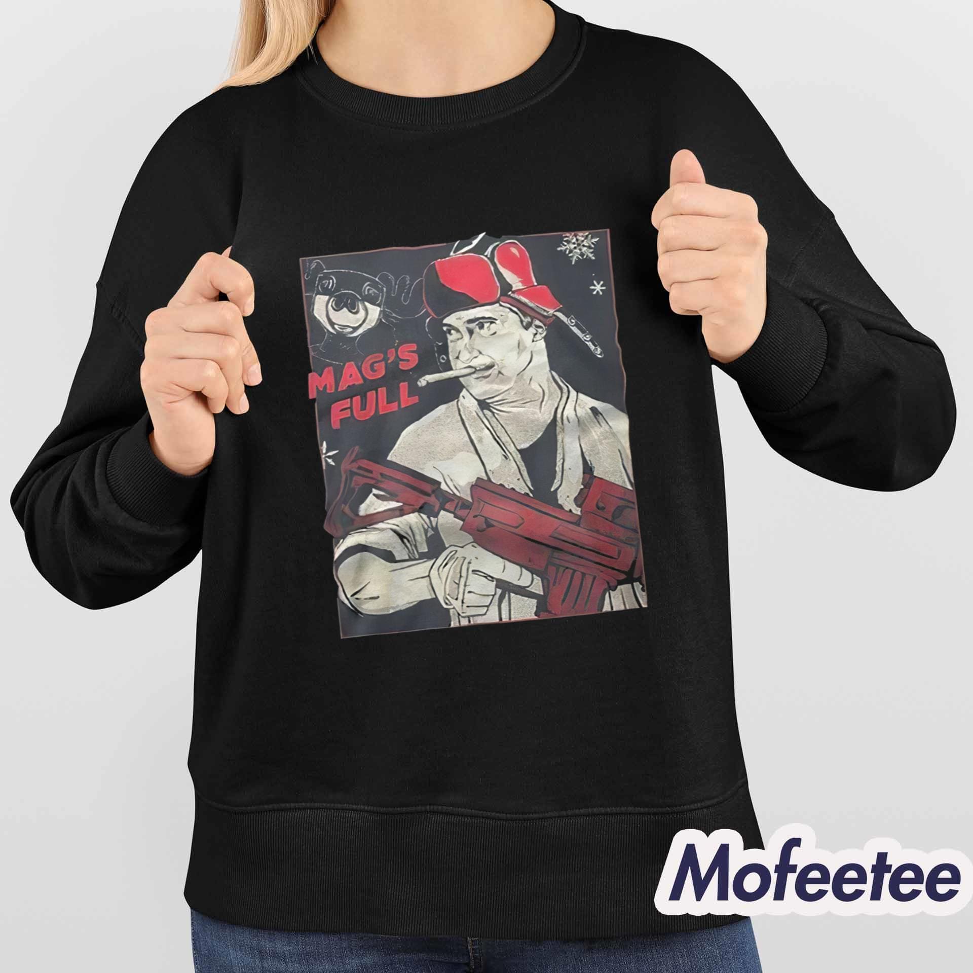 This shirt features a striking graphic print that immediately grabs attention. The design showcases a stylized illustration of Randy Quaid in a humorous holiday outfit, complete with a bold red hat, oversized gear, and the classic line “MAG’S FULL” printed in standout lettering. The artwork uses vintage-inspired tones and comic-style shading, giving it a retro holiday poster vibe that’s funny, dramatic, and incredibly eye-catching.
