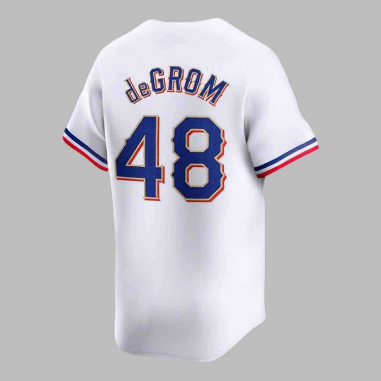 The classic white color with red and blue accents makes it perfect for displaying your team spirit in true Rangers fashion. The jersey features a traditional button-down design with the Rangers logo across the front. On the back, deGrom’s name and number 48 are emblazoned in bold letters, making it clear who you’re supporting. Available in multiple sizes, this jersey provides a perfect fit for fans of all ages.