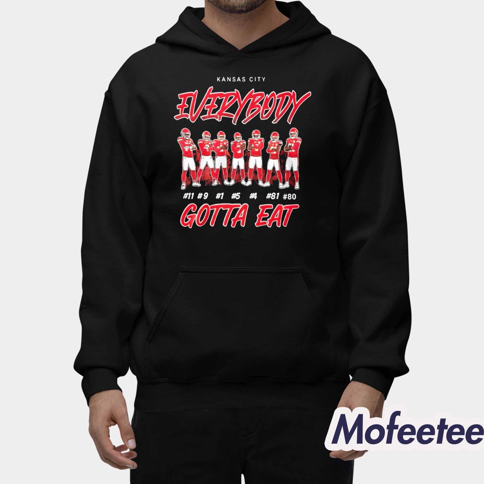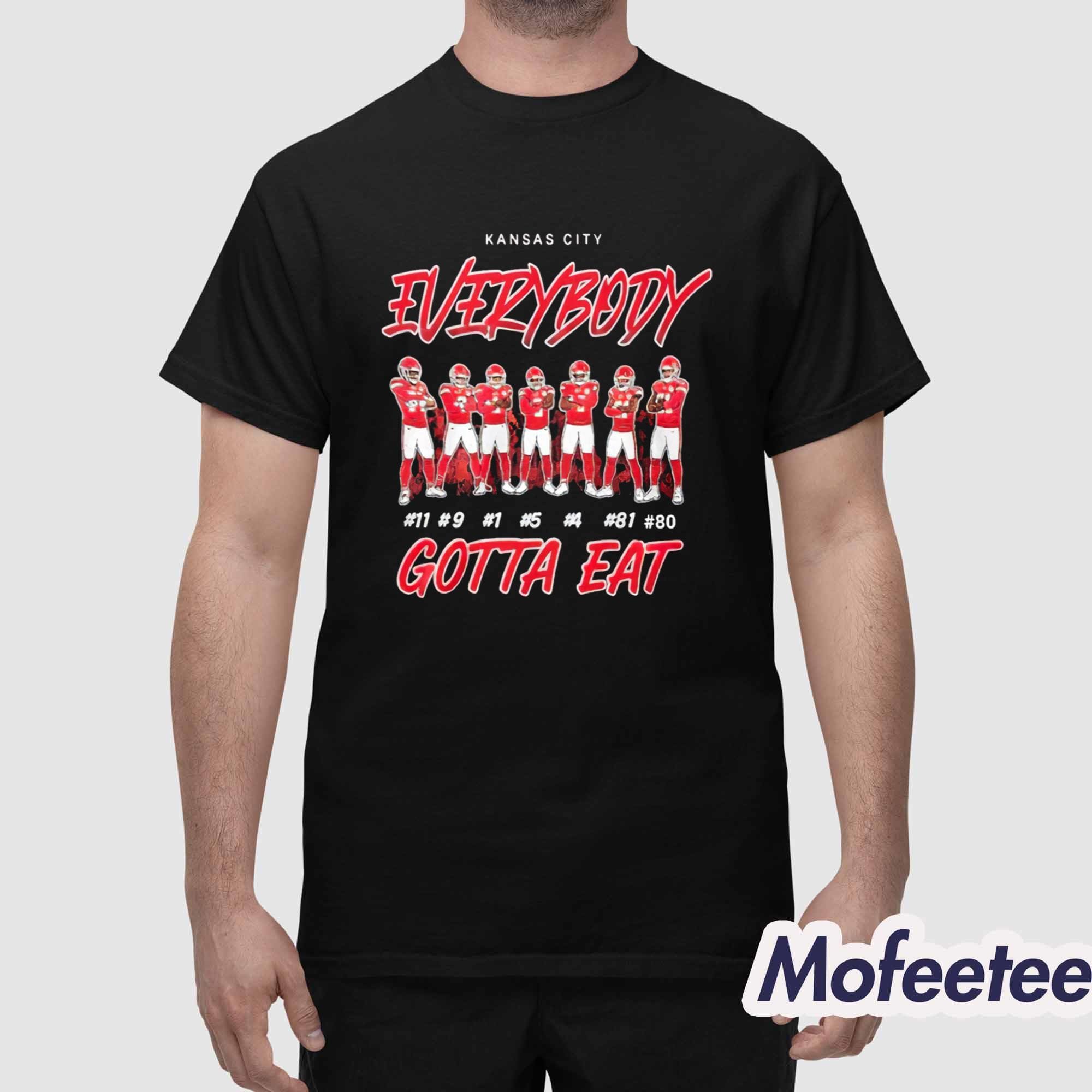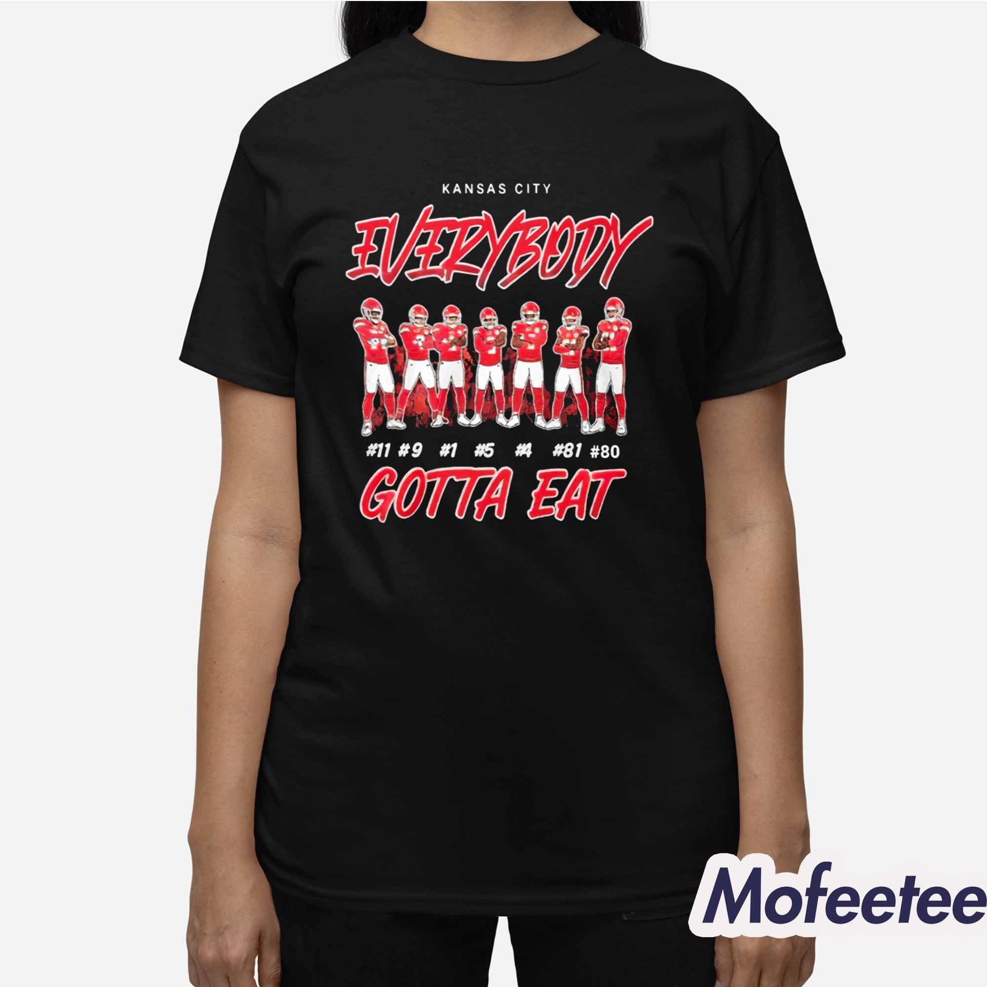 The shirt features a unique graphic showcasing Chiefs players, including Rashee Rice, alongside numbers #11, #9, #6, #81, #80, and more. The energetic phrase “EVERYBODY GOTTA EAT” is displayed prominently in a bold red font that complements the team’s vibrant color scheme. This shirt is a perfect way to display your excitement for the Chiefs’ offensive power and Rashee Rice’s impact on the field.