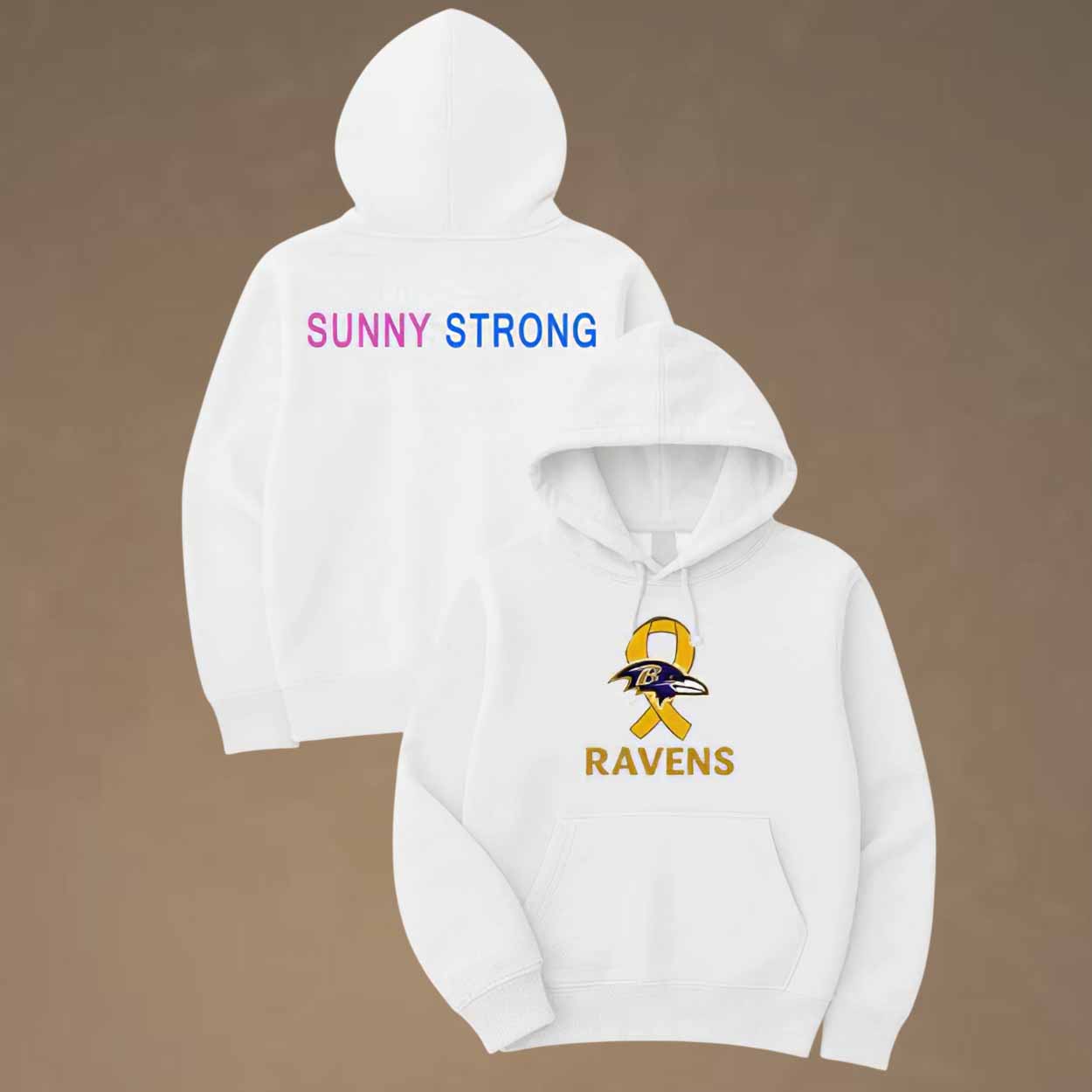 The hoodie features a sleek white design with the Baltimore Ravens logo paired with a gold awareness ribbon on the front—symbolizing strength, unity, and support for those battling cancer. The back displays the phrase “SUNNY STRONG” in bold pink and blue lettering, representing courage and community togetherness.