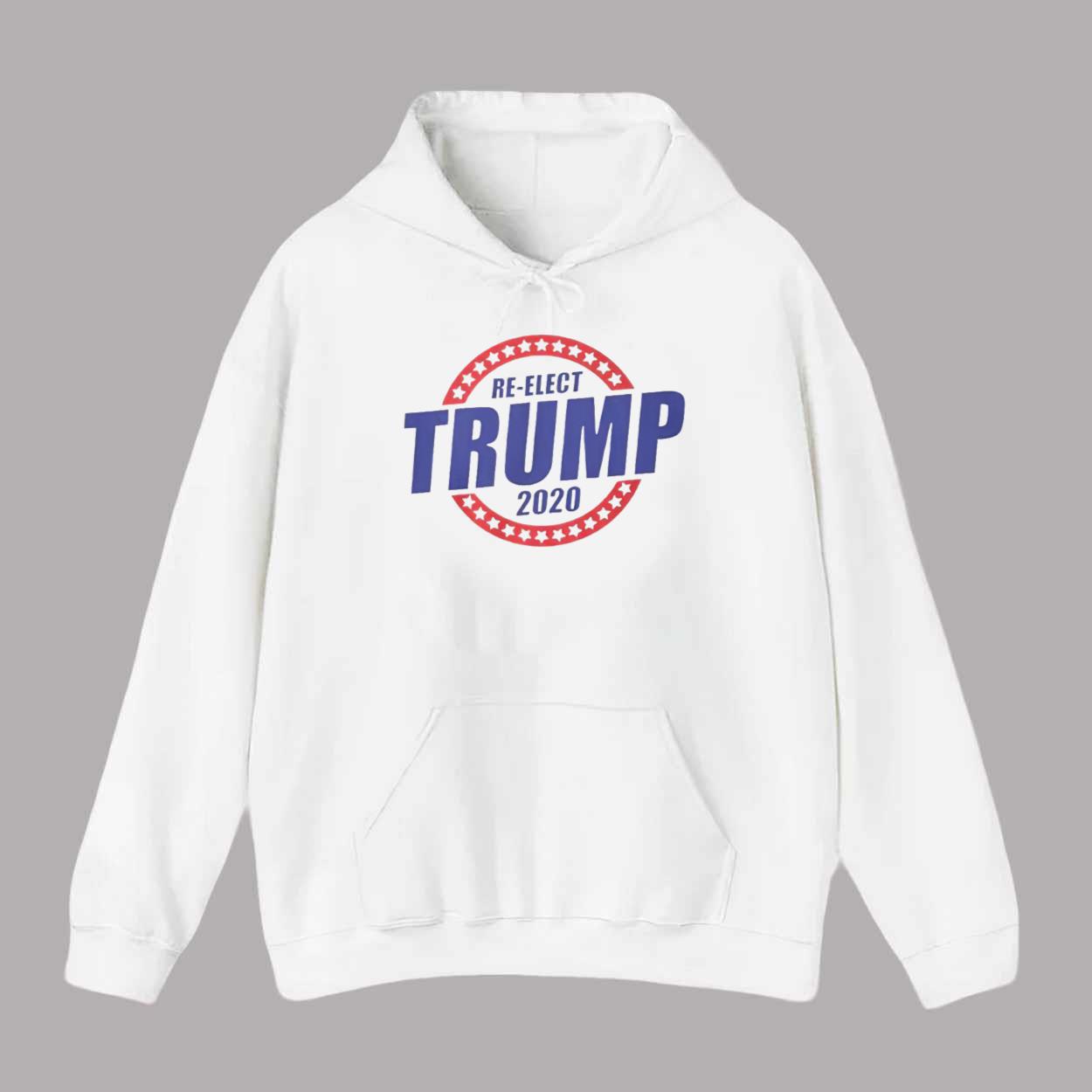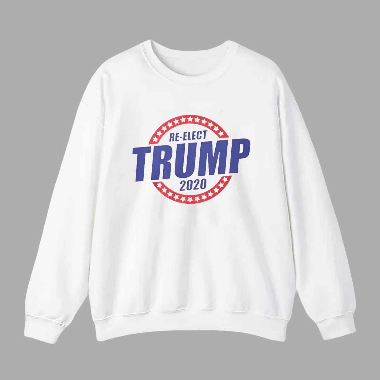 This shirt features a striking design, with the words “RE-ELECT TRUMP 2020” set in bold blue and red letters, surrounded by a circle of stars, reminiscent of a campaign button. It’s perfect for those who want to show their unwavering support for Trump’s vision and leadership. Whether you’re attending rallies, showing off your patriotism, or simply adding to your political wardrobe, this shirt offers both comfort and style.