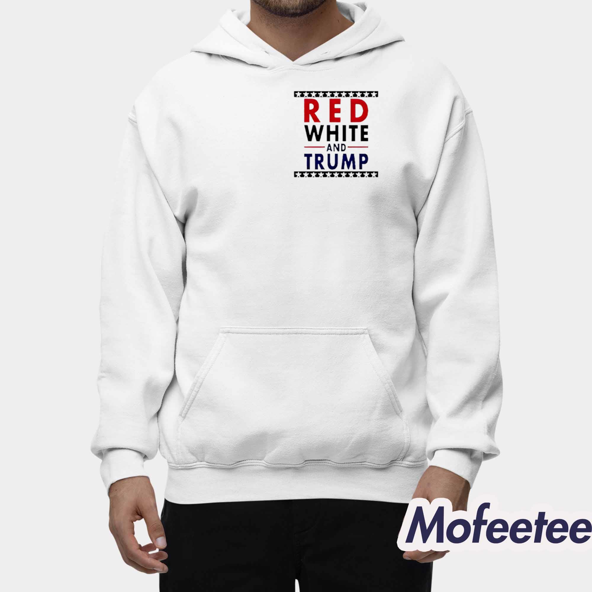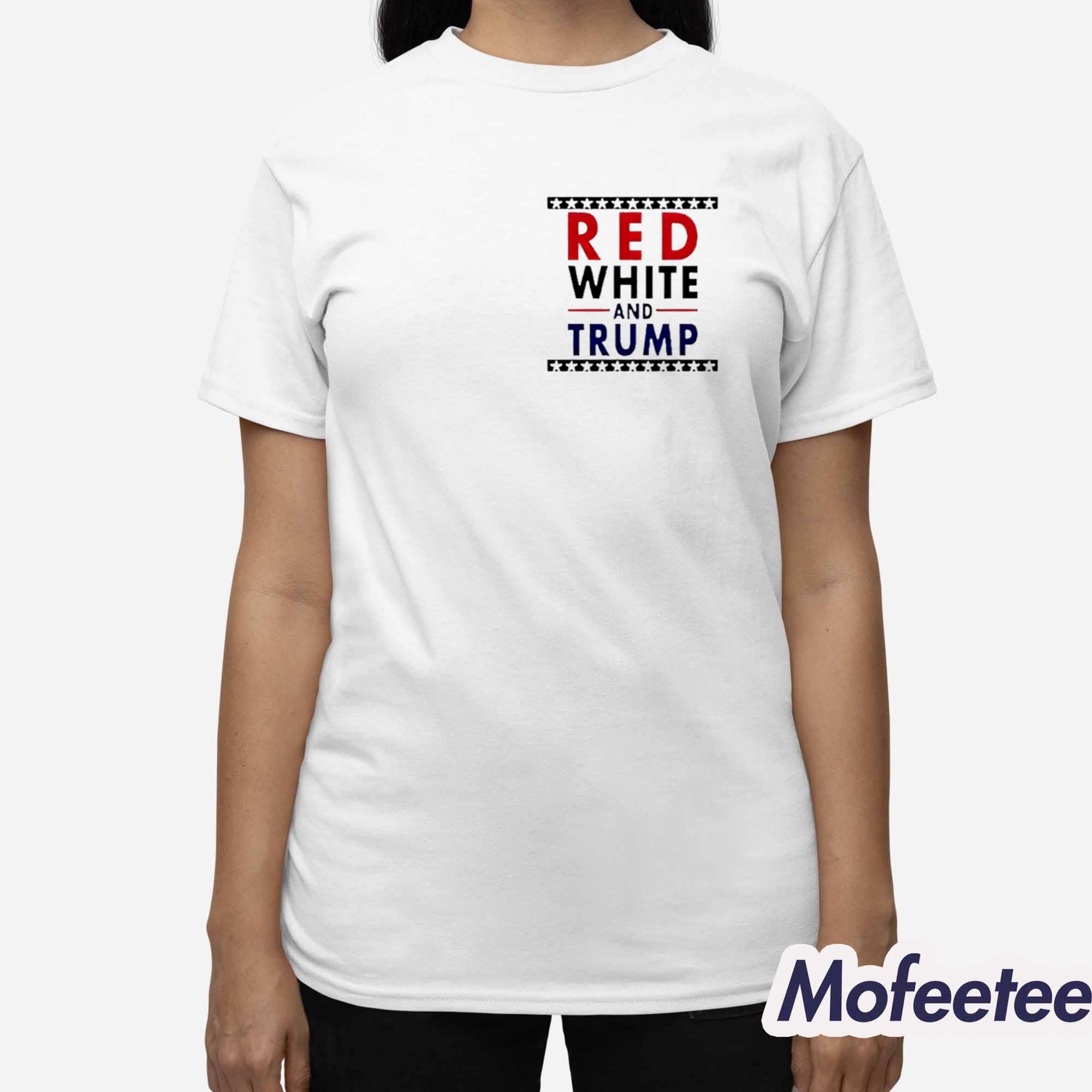 The shirt features a clean and direct design. The words “RED,” “WHITE,” and “TRUMP” stand out in red, black, and blue text, separated by patriotic star-and-stripe borders above and below. The layout is sharp, centered, and powerful—perfect for making your voice seen as well as heard.