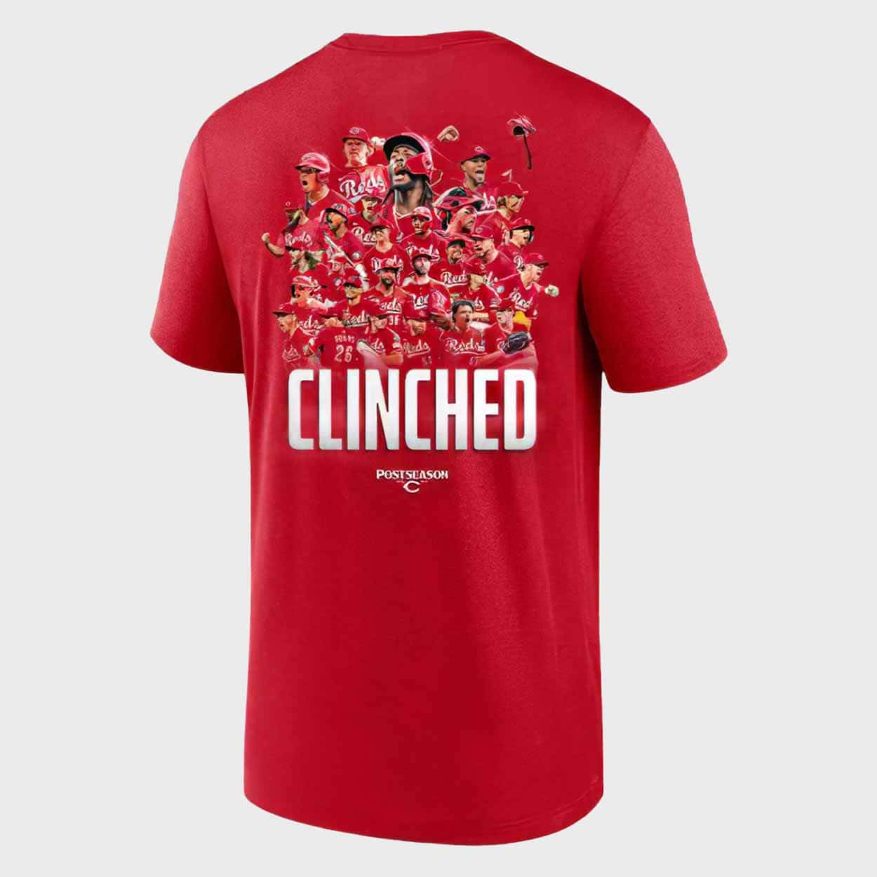 The back design takes fan pride even further with a vibrant graphic collage of Reds players above the word “CLINCHED”, signifying their spot in the postseason. This two-sided design ensures your passion is seen from every angle, making it a must-have for game days and fan collections alike.