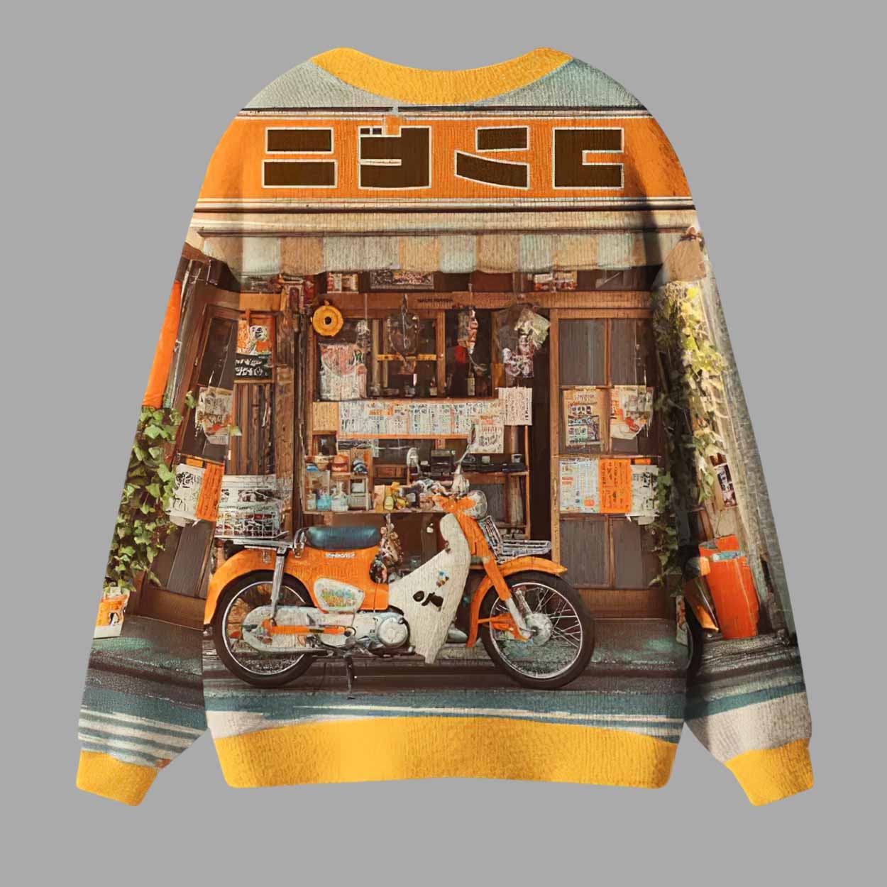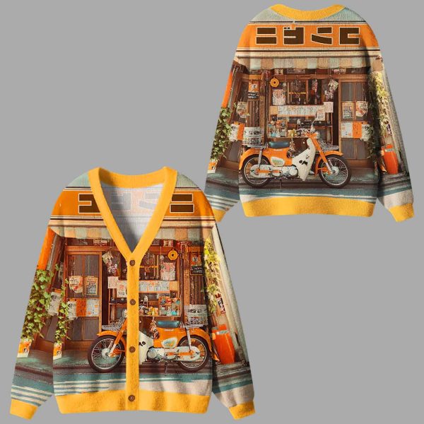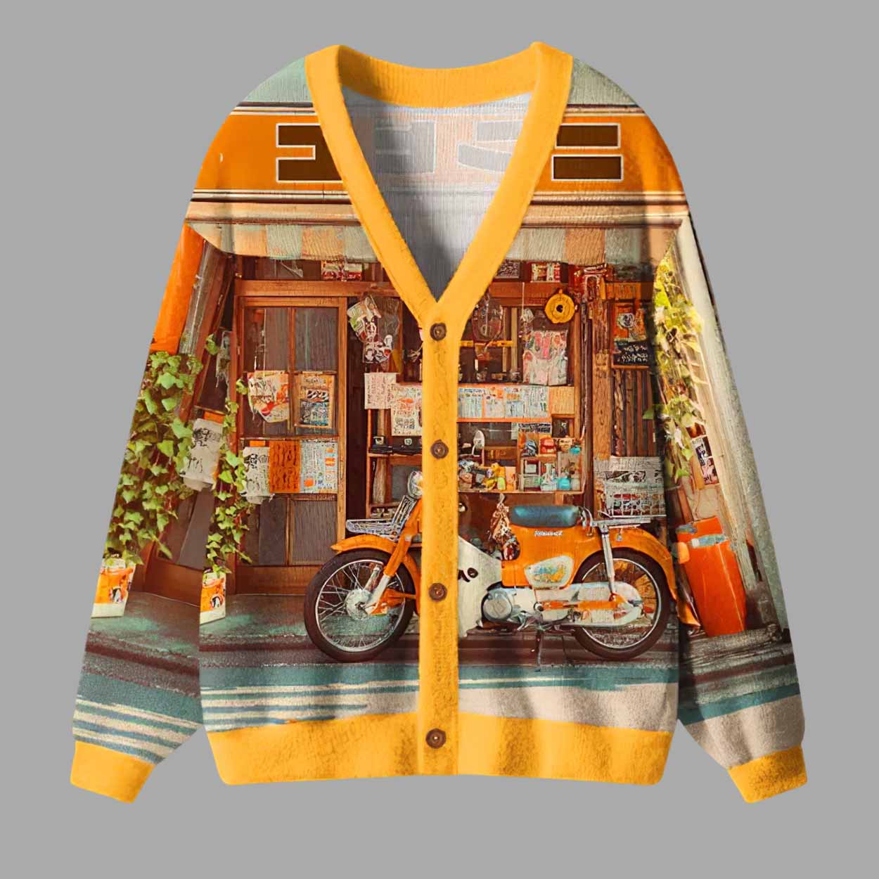 This cardigan features a full-coverage, high-definition print showcasing a vintage storefront paired with a bright retro motorbike parked out front. The artwork is rich in detail—old posters, plants, warm wooden textures, and subtle shadows all create a lively, nostalgic atmosphere across the garment. Both the front and back are completely wrapped in this scenic design, offering a true 360-degree visual experience.
