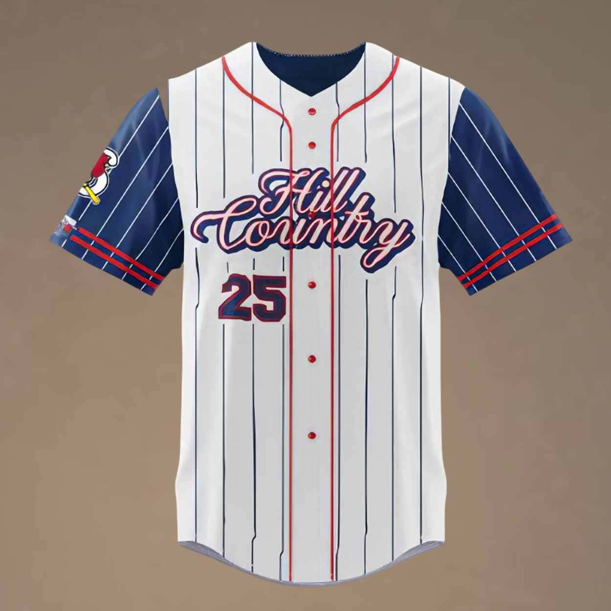 The classic white base, complemented by navy blue accents, gives it a timeless yet modern look, while the “Hill Country” lettering on the front adds a touch of authenticity. The bold red piping along the seams and sleeve cuffs creates an eye-catching contrast, making it a stand-out piece in any collection.