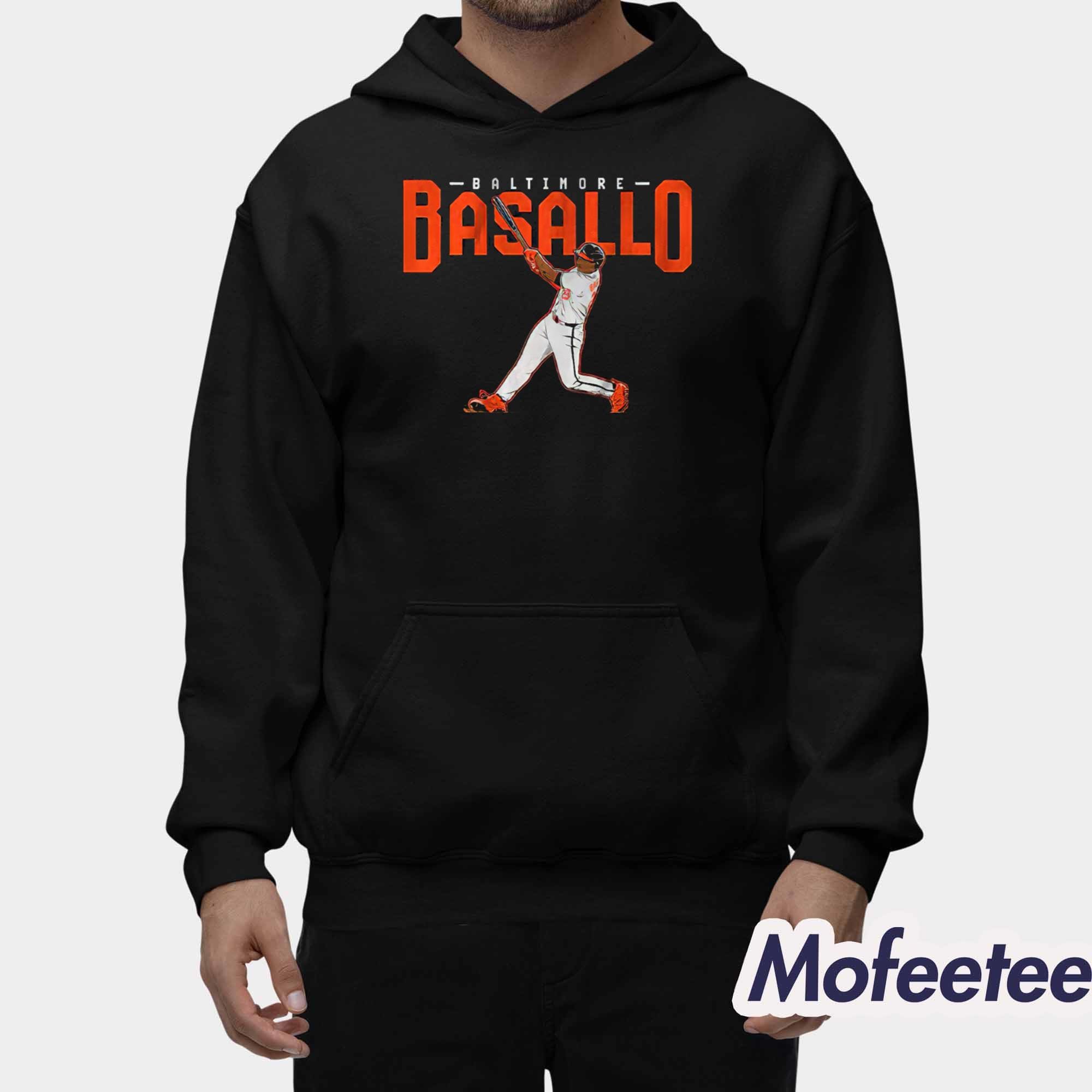 The shirt features a dynamic design that captures the energy and power of Basallo’s swing. The bold “BALTIMORE” text across the top stands out, complemented by a stunning illustration of Basallo mid-swing. The contrast of orange and white against the black background makes the design pop, giving the shirt a modern, stylish look. The shirt is perfect for those who want to showcase their love for baseball and support for Samuel Basallo in a unique and bold way.