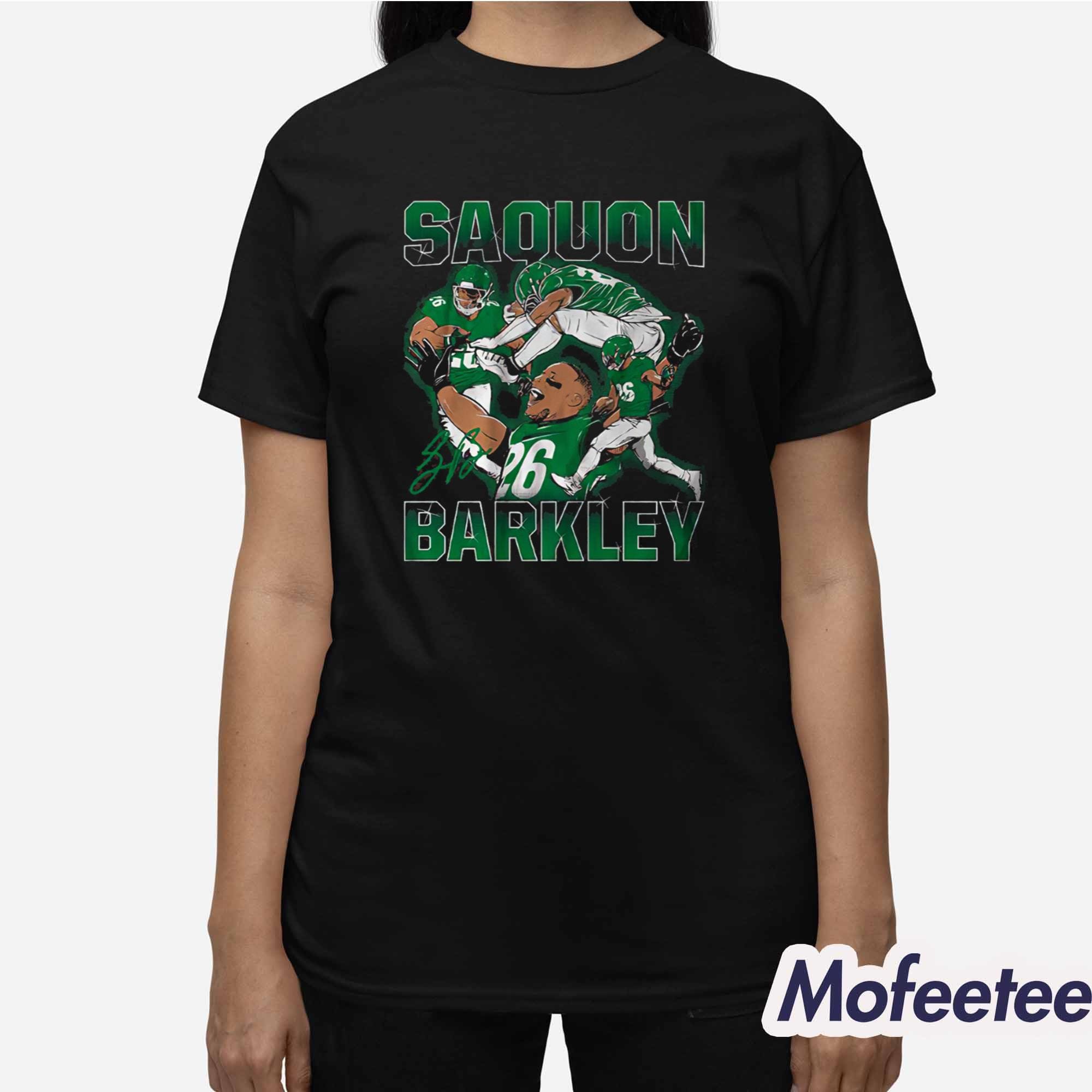 The shirt features a dynamic, action-packed graphic of Saquon Barkley in full stride, showcasing his explosive athleticism. The design is bold, with “SAQUON” and “BARKLEY” printed in strong, eye-catching green lettering, creating a striking contrast with the graphic. His number 26 is prominently displayed as a reminder of his impactful presence on the field.