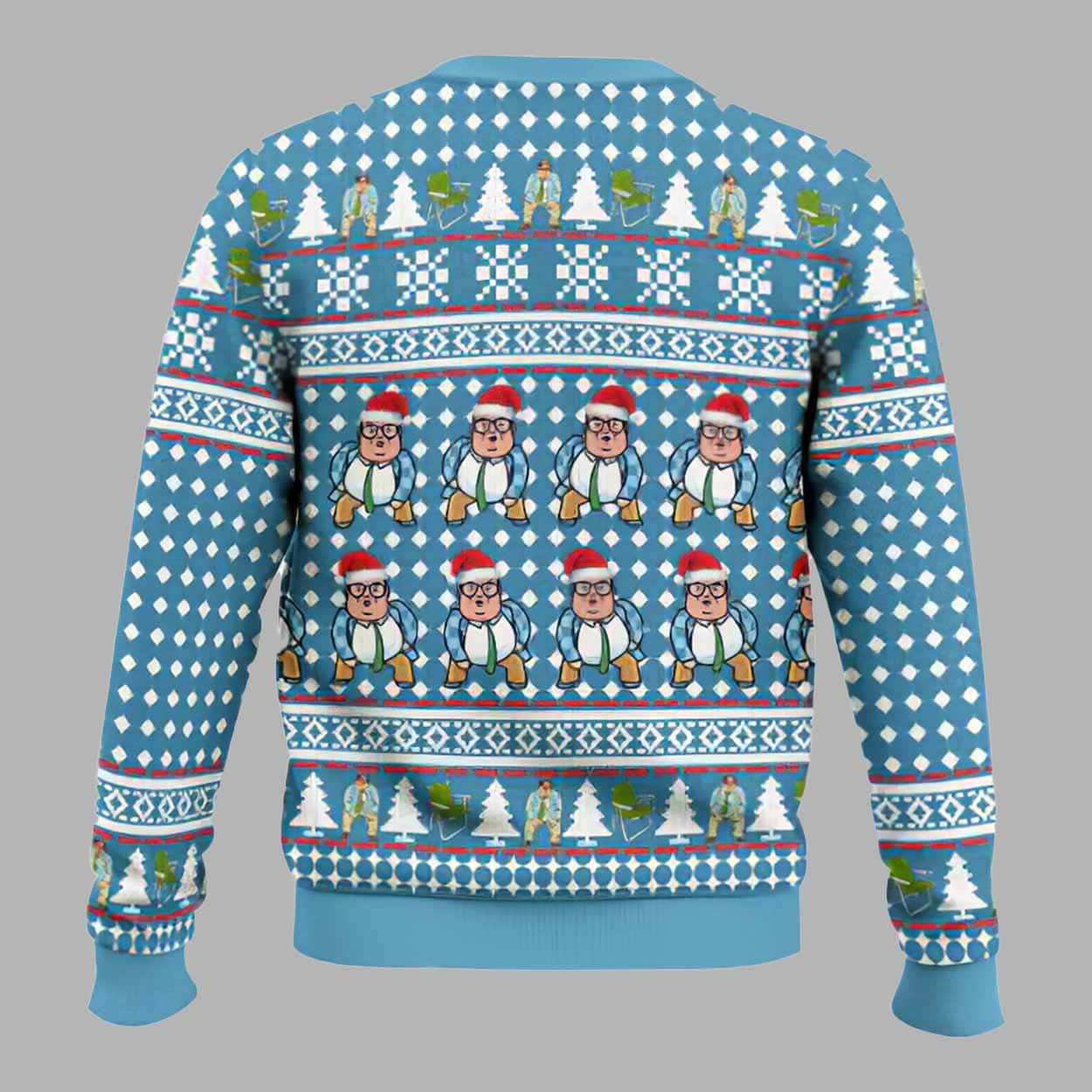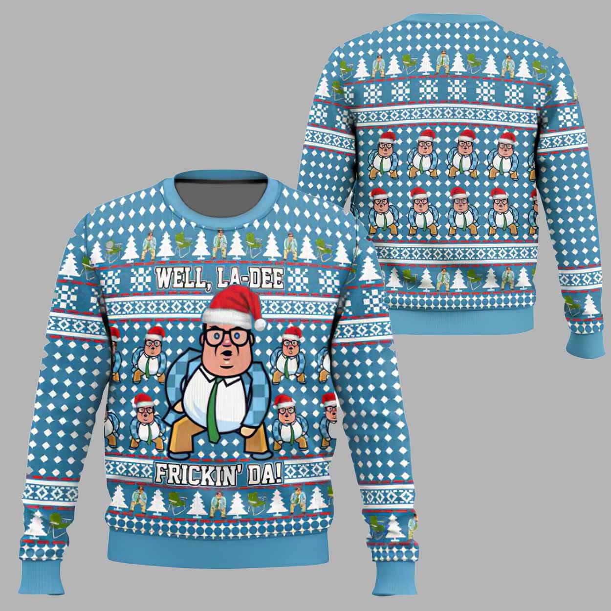The design features Matt Foley in his iconic plaid jacket, paired with the catchphrase “Well, La-Dee Frickin’-Da!” across the chest. Surrounded by playful holiday patterns, including snowflakes, Christmas trees, and festive colors, this sweater captures both seasonal cheer and comedic charm. The bright blue background makes the design pop, ensuring you’ll stand out in any crowd.