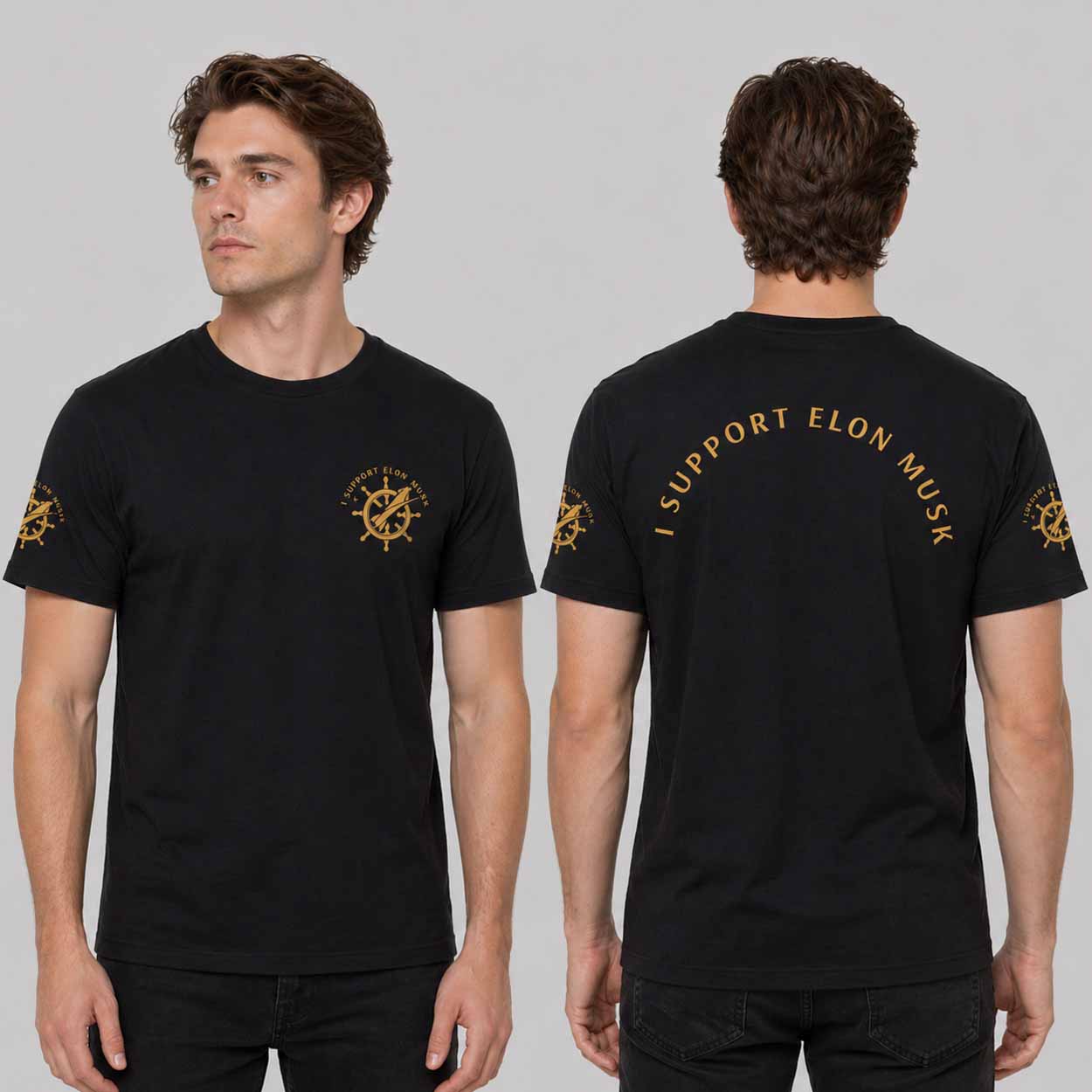 This shirt features a minimalist yet powerful design that immediately grabs attention. The front showcases a small, detailed emblem with a ship wheel and rocket motif, symbolizing exploration, ambition, and forward-thinking ideas. On the back, the curved “I Support Elon Musk” text creates a strong visual impact while maintaining a balanced and stylish layout.