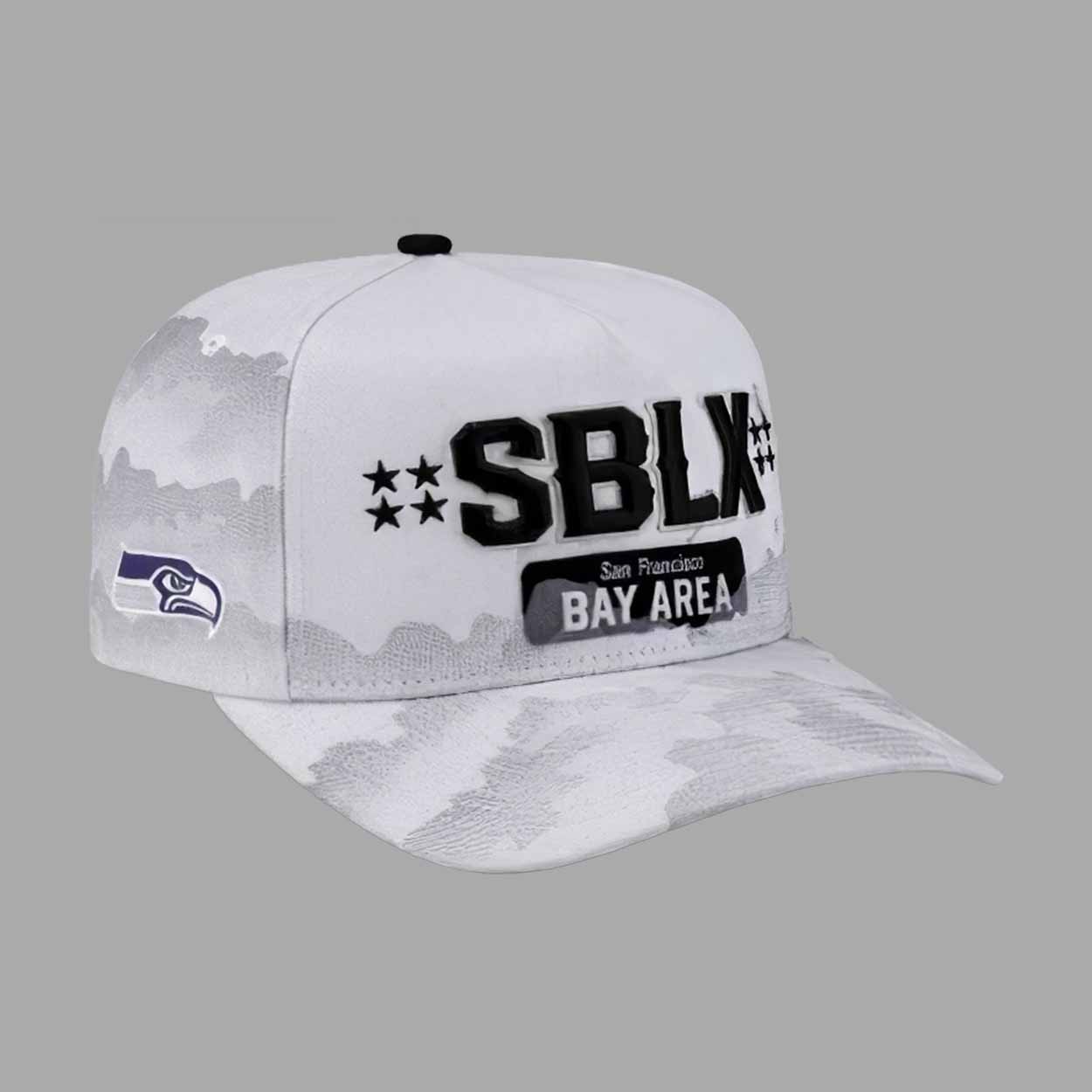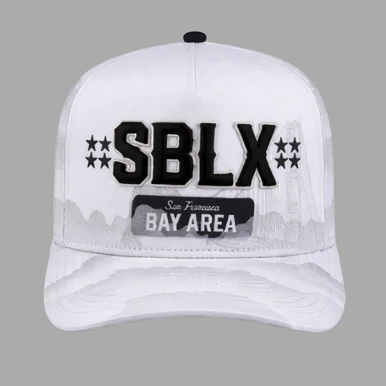 This hat features a structured crown with a crisp white and light-grey tarmac-style pattern that adds texture and depth without overwhelming the design. Front and center, the raised “SBLX” lettering instantly marks the Super Bowl LX moment, while the “Bay Area” patch beneath adds a commemorative feel that ties the design to the historic stage. Subtle star accents frame the text, reinforcing the championship theme in a clean, balanced way.