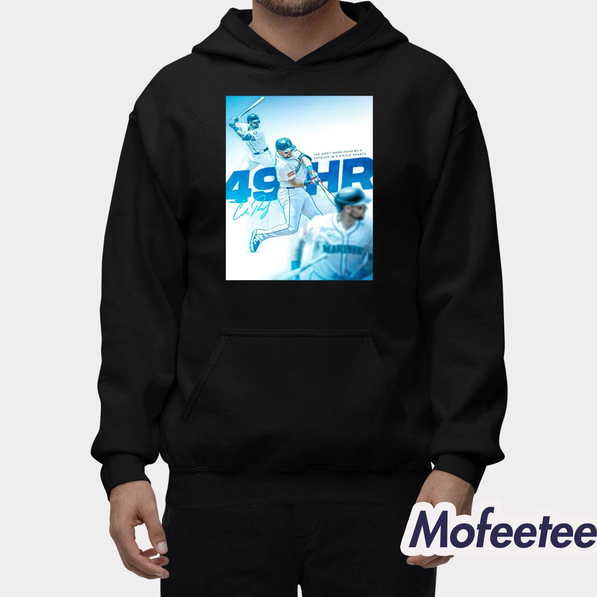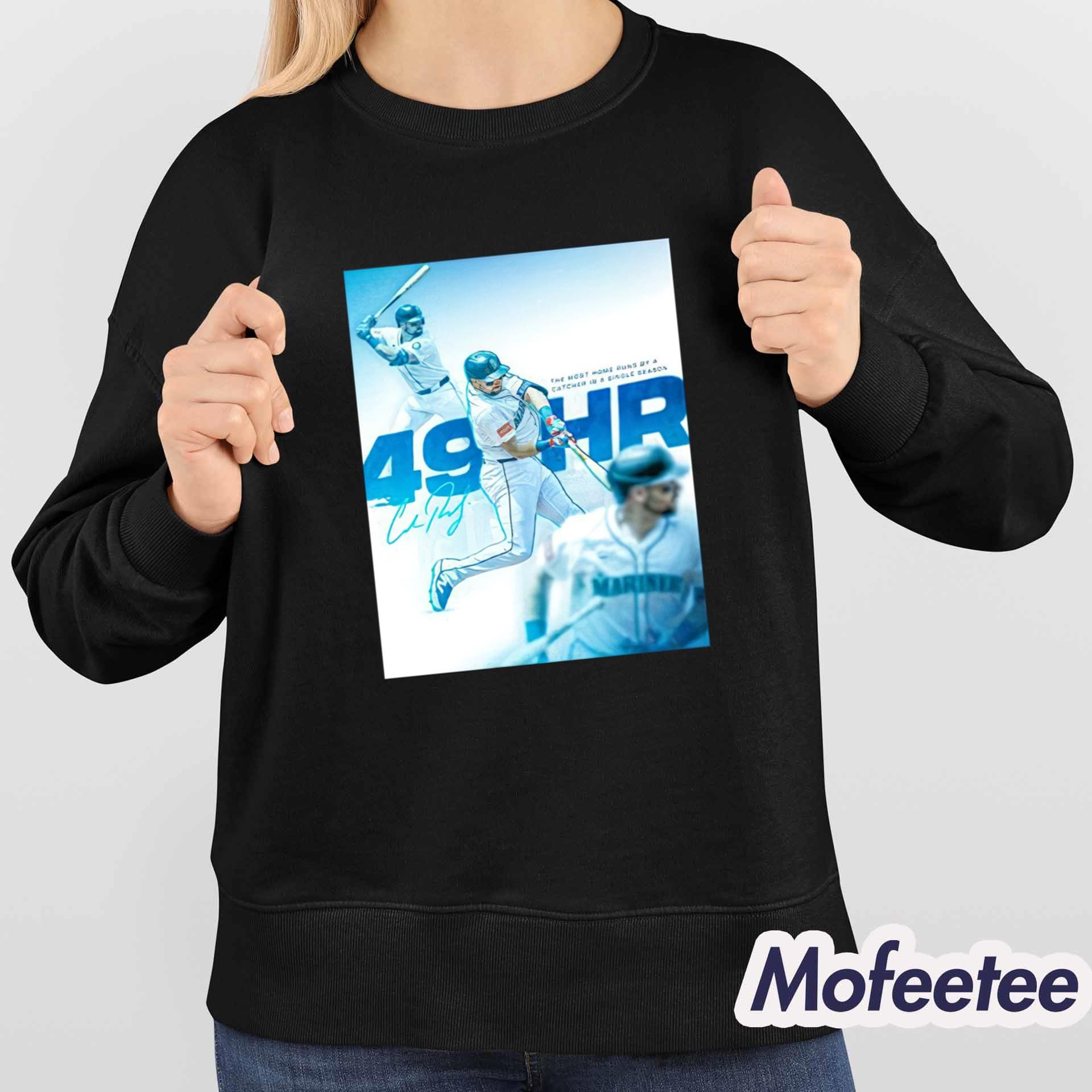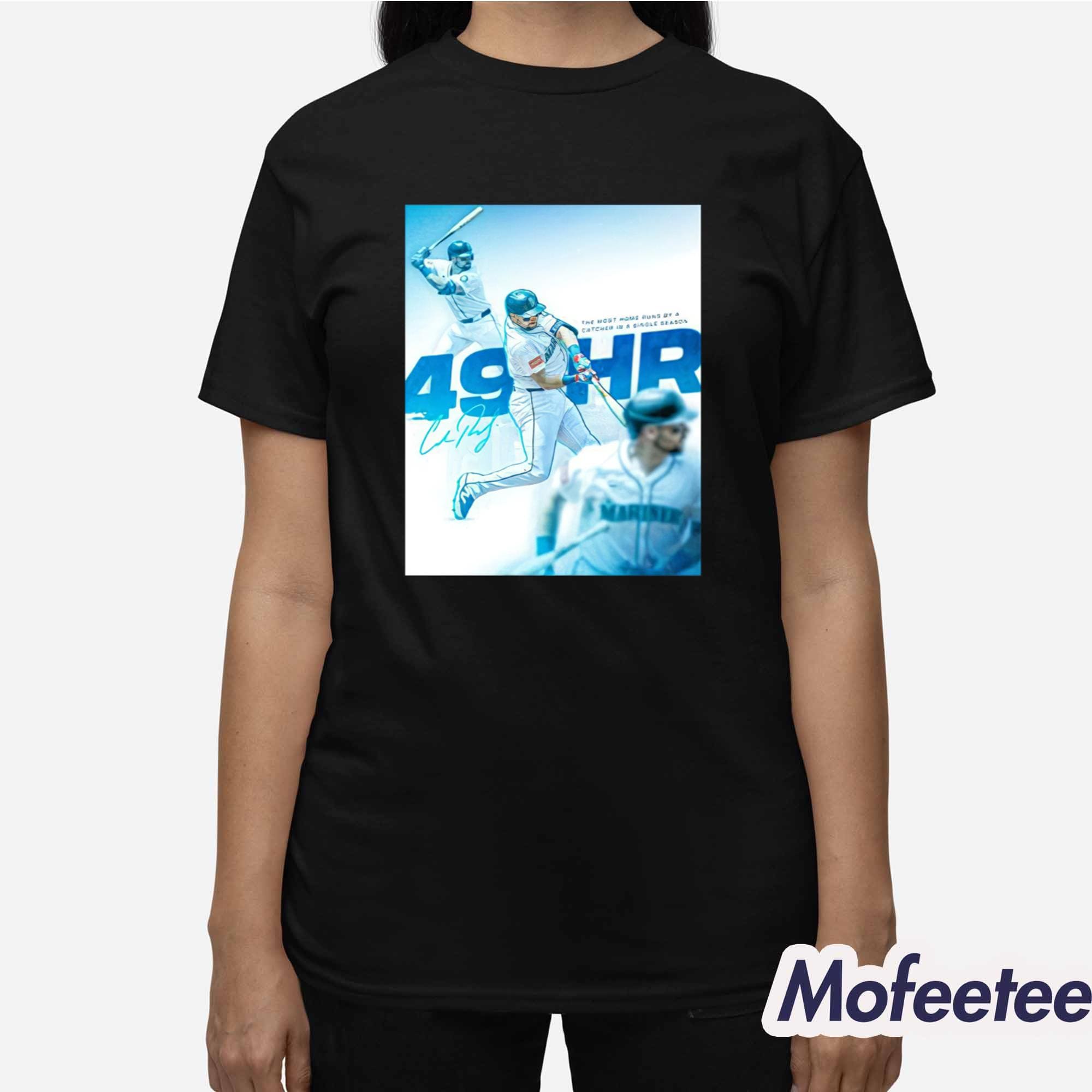 The shirt features a dynamic graphic of Cal Raleigh in action, with bold text and vibrant blue tones that highlight his record-breaking home runs and contributions to the team. The design not only celebrates the Mariners but also reflects the energy and passion Raleigh brings to every game.