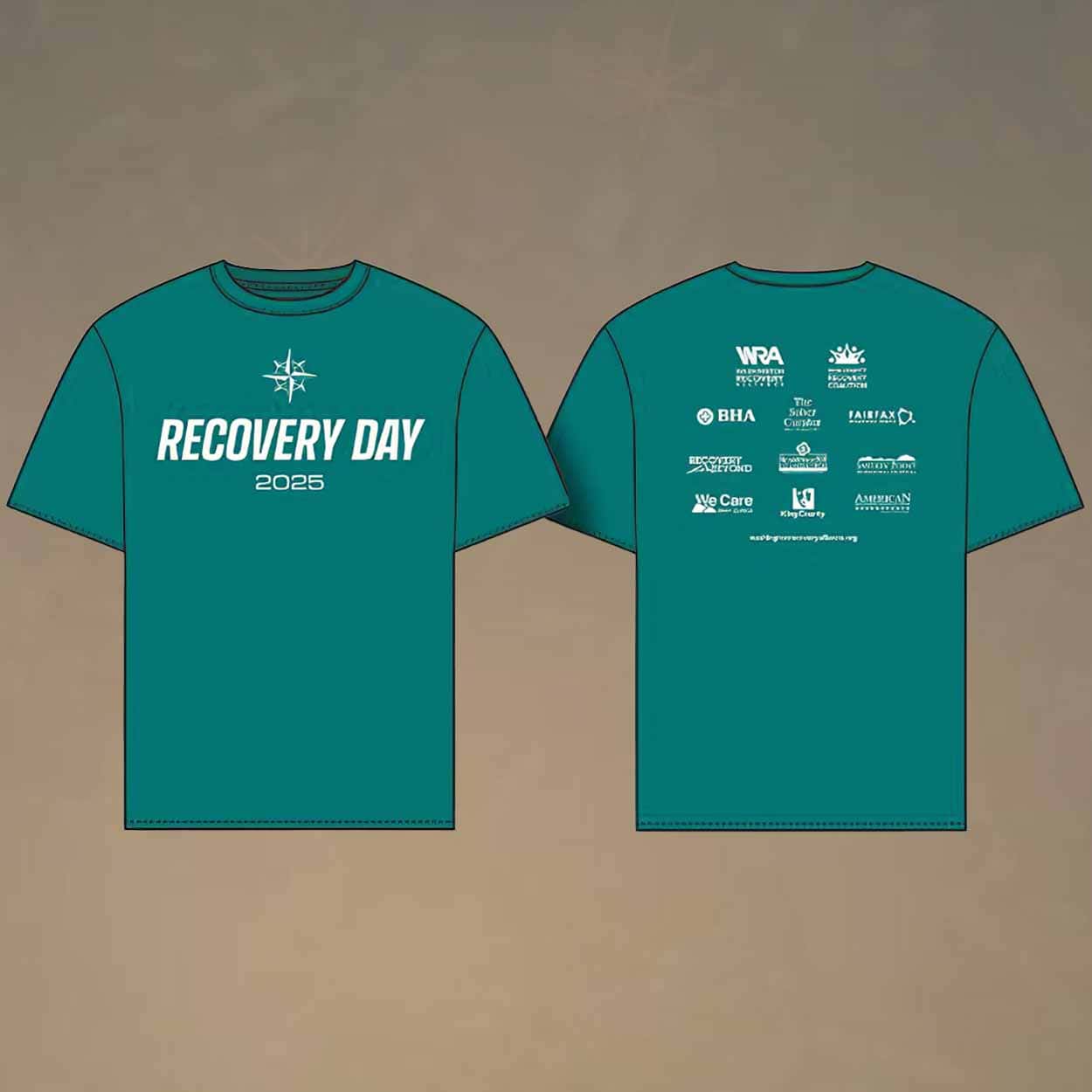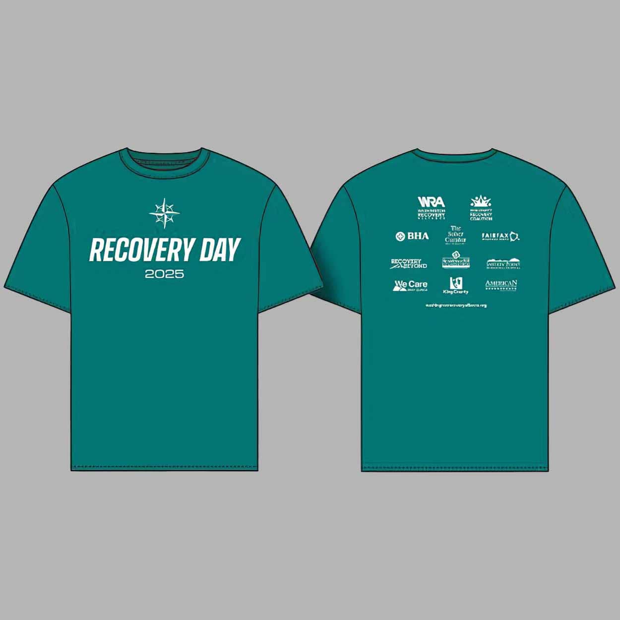 The shirt features the “RECOVERY DAY 2025” text on the front, along with sponsor logos on the back, showing support from key partners in the recovery community. The combination of bold text and sponsor recognition creates a sleek and impactful design.
