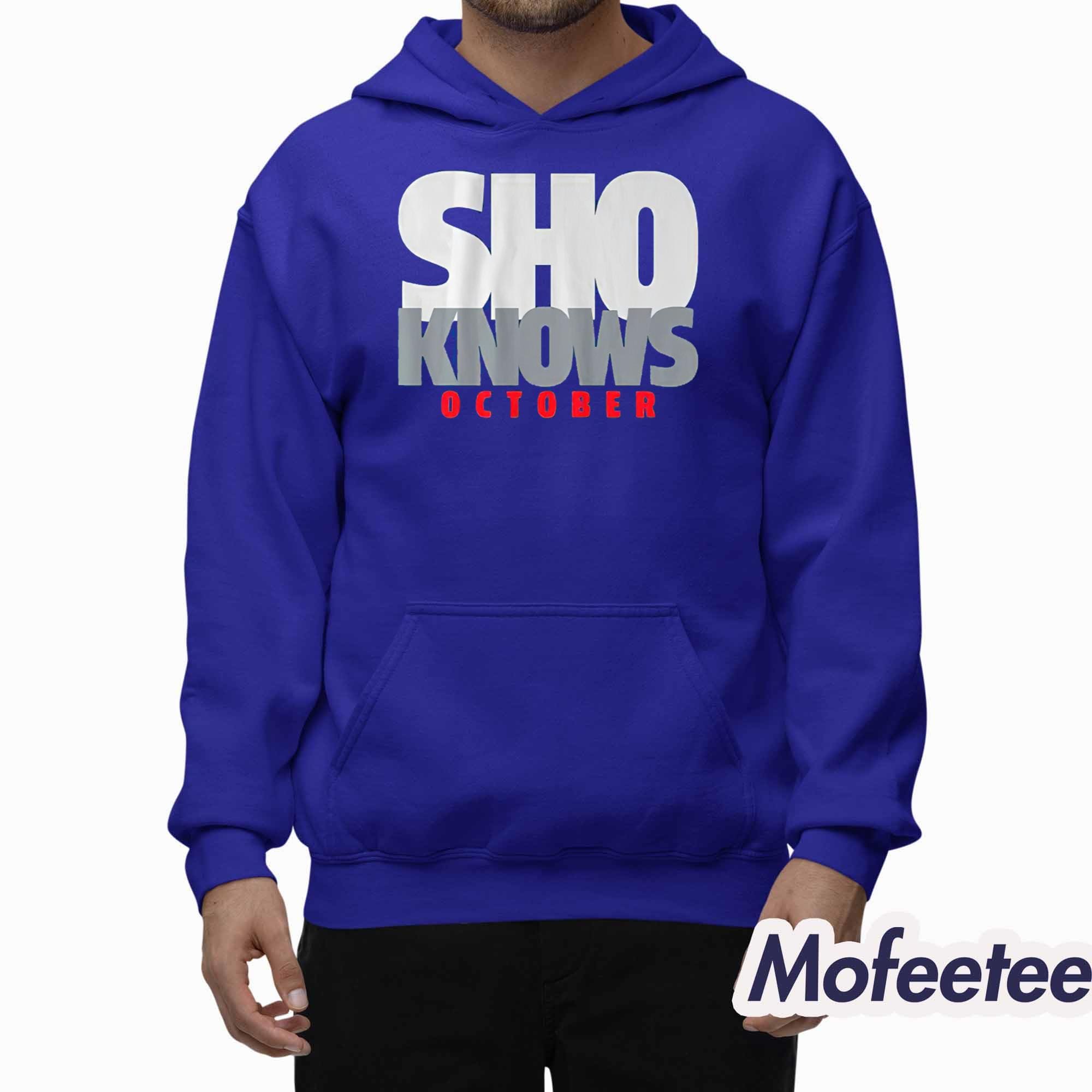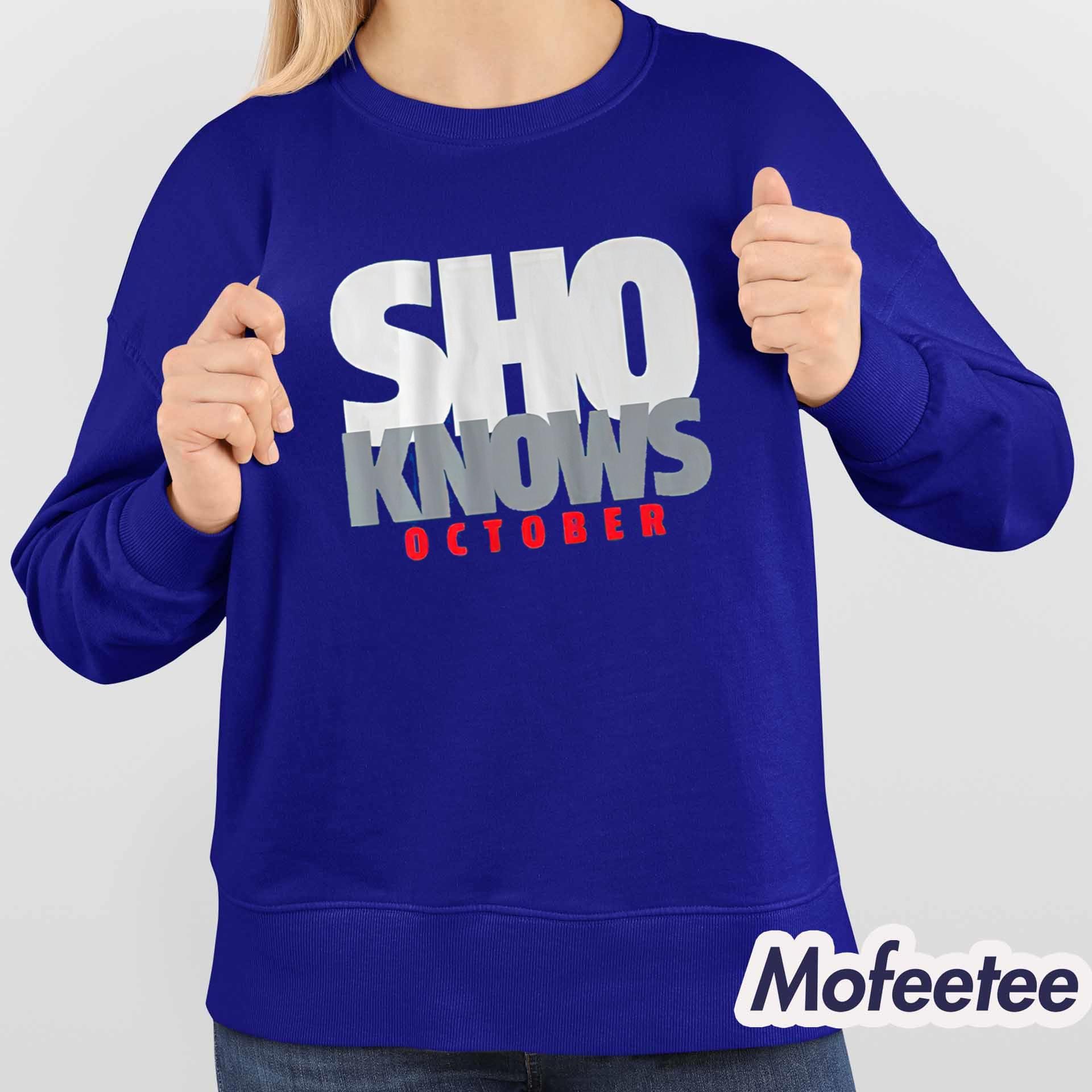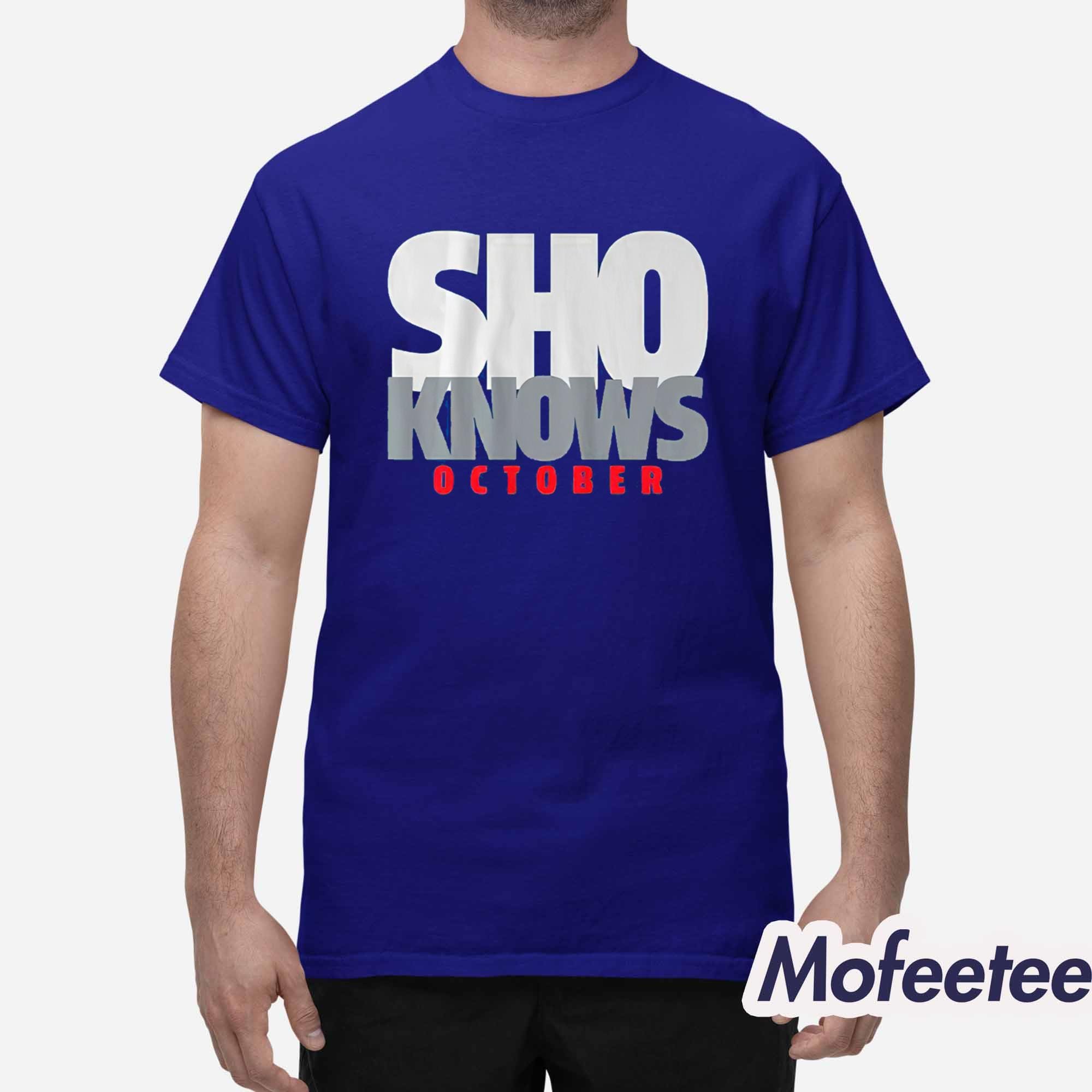 The shirt showcases a bold, statement-making graphic with the phrase “SHO KNOWS OCTOBER” in powerful block lettering — silver, white, and red — perfectly symbolizing postseason dominance. The clean, minimalist design reflects Ohtani’s cool composure and elite performance under pressure.