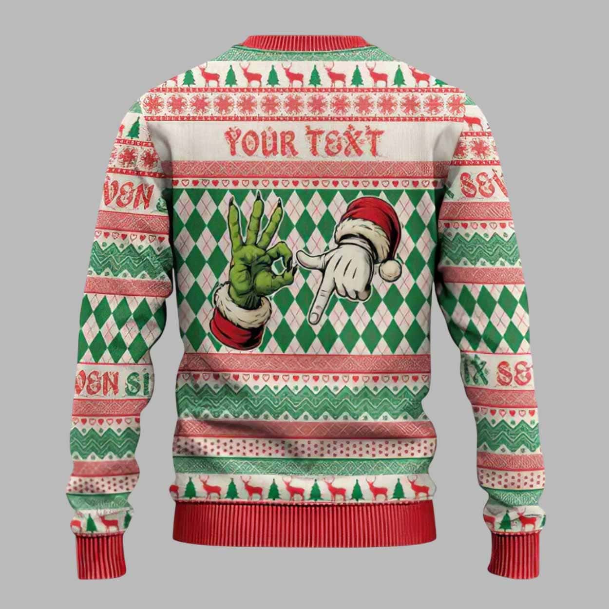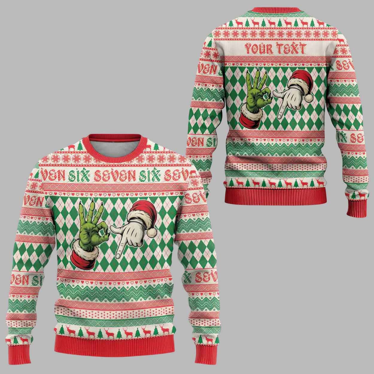 Bring humor and holiday cheer together with the Six Seven Meme Personalized Ugly Christmas Sweater! Inspired by the viral “Six Seven” hand sign meme, this hilarious sweater perfectly blends pop culture fun with the cozy charm of classic Christmas knitwear. Whether you’re celebrating with family, attending an ugly sweater party, or looking to make your friends laugh, this sweater ensures all eyes are on you. With a playful design featuring a green Grnch-style hand and a Santa glove forming the iconic “6” and “7” signs, it’s a clever way to show off your personality and sense of humor.
