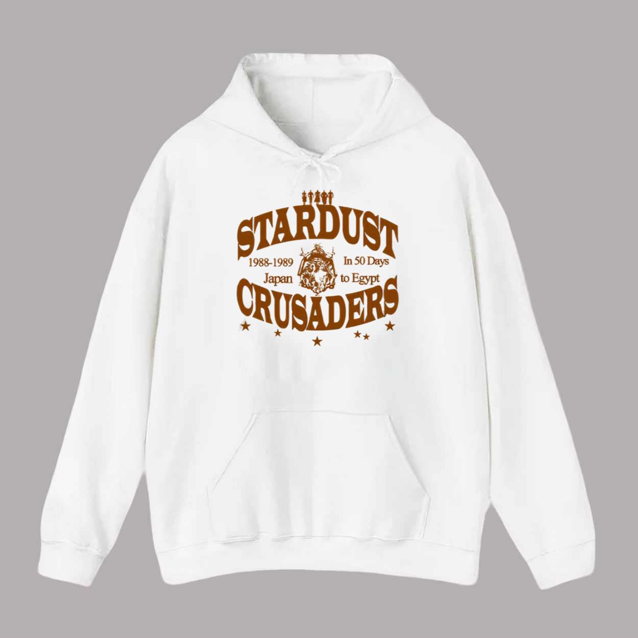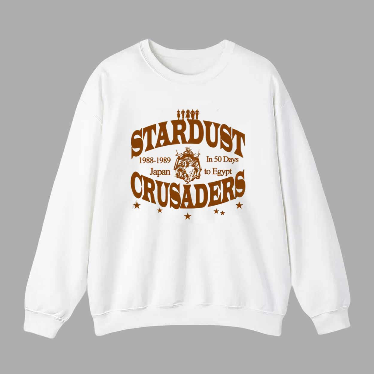 The shirt features a vintage-style brown print on a crisp white background, giving it a timeless, retro vibe that fans of both anime and classic band tee design will love. With bold lettering reading “STARDUST CRUSADERS” and supporting details like “1988–1989,” “Japan to Egypt,” and “In 50 Days,” this shirt feels like a commemorative tour tee—only for the most dangerous journey in anime history.