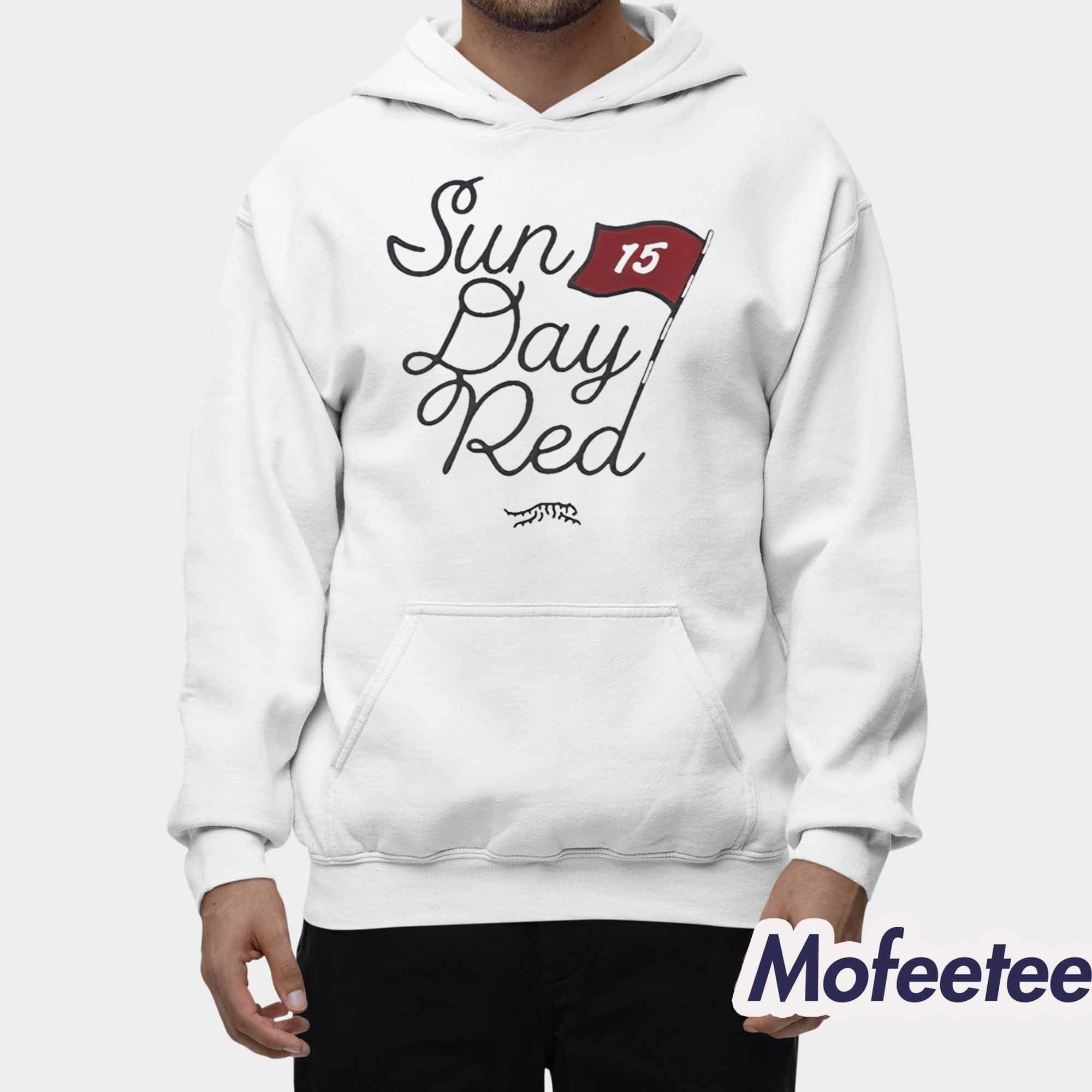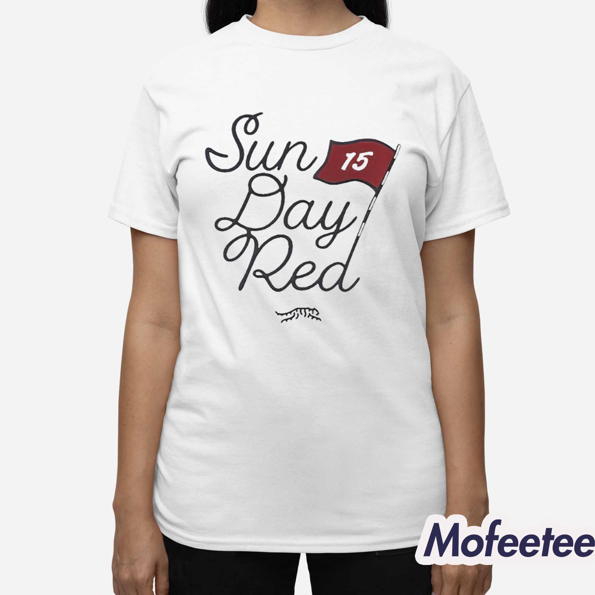 The Sun Day Red 15 Bay Shirt is perfect for golf fans and casual style lovers alike. With a hand-lettered “Sun Day Red” script and a signature red flag featuring the number 15, this shirt is a subtle nod to the tradition of greatness seen on Sunday afternoons.