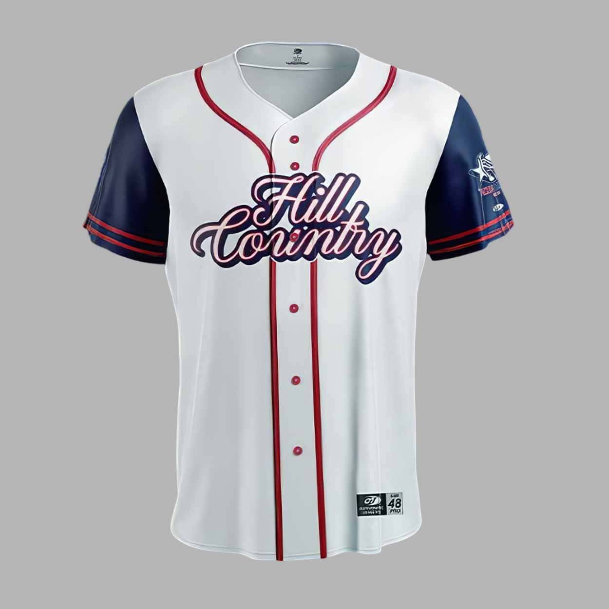 The jersey 2025 giveaway features a clean, classic design with bold red and navy accents that perfectly represent the team colors. The front of the jersey showcases the words “Hill Country” in large, flowing script, capturing the essence of the community and its pride. The sleeves are designed in navy, with contrasting red stripes on the shoulders, adding a sleek and modern touch.