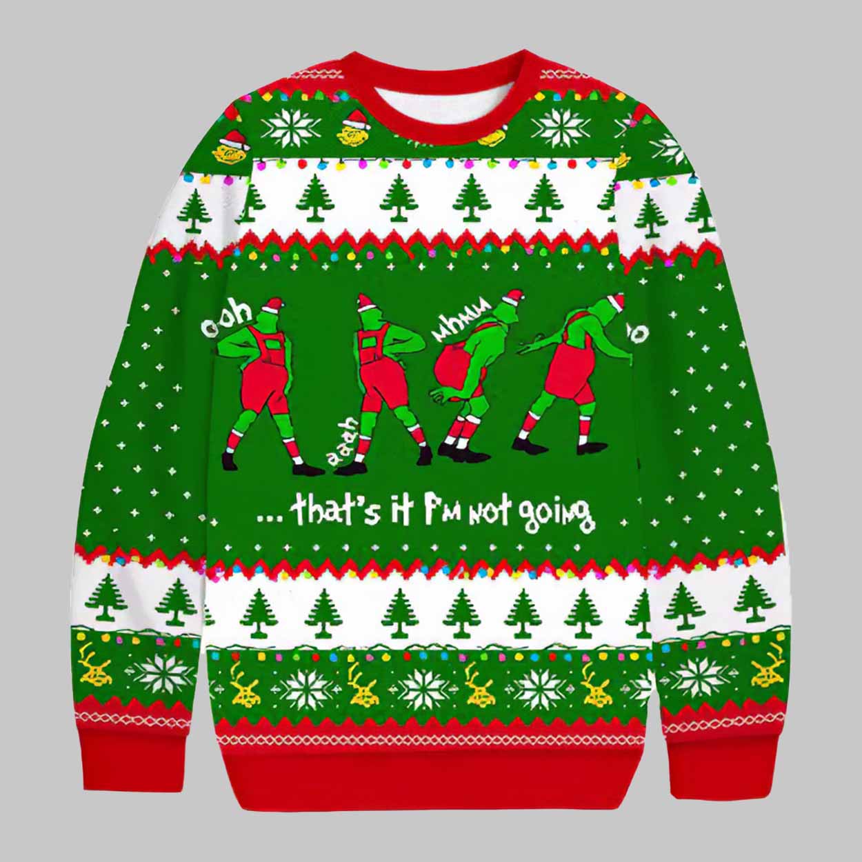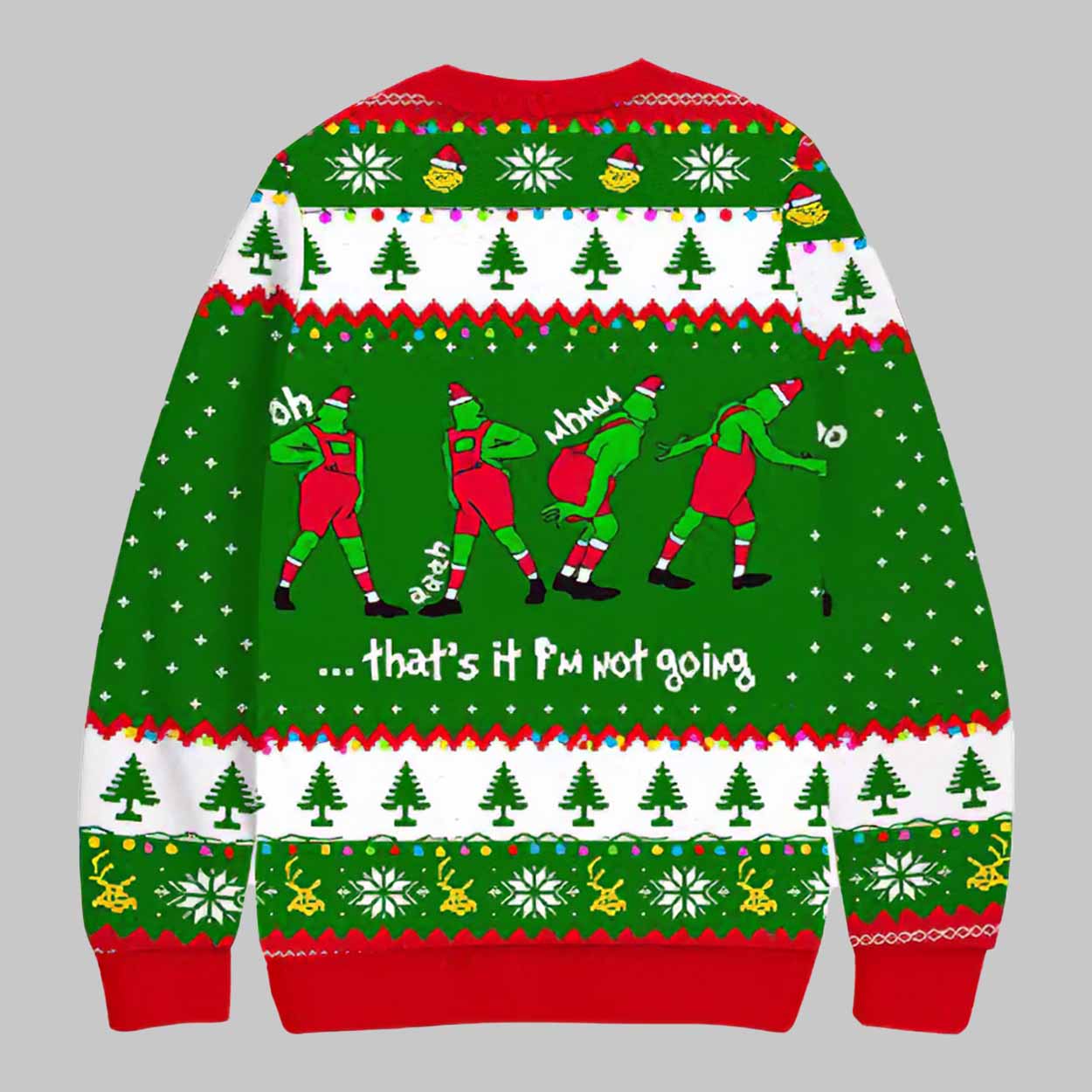 This ugly christmas sweater features a playful design of the Grinch in a holiday setting, complete with his signature red outfit and mischievous expression. The design includes the quote “…that’s it I’m not going” with the Grinch striking a signature pose, adding a comedic flair to the festive theme. Surrounding the central design, you’ll find vibrant Christmas tree motifs, snowflakes, and fun patterns typical of the holiday season. The bold green and red color scheme is perfect for embracing the Christmas spirit while standing out with humor.