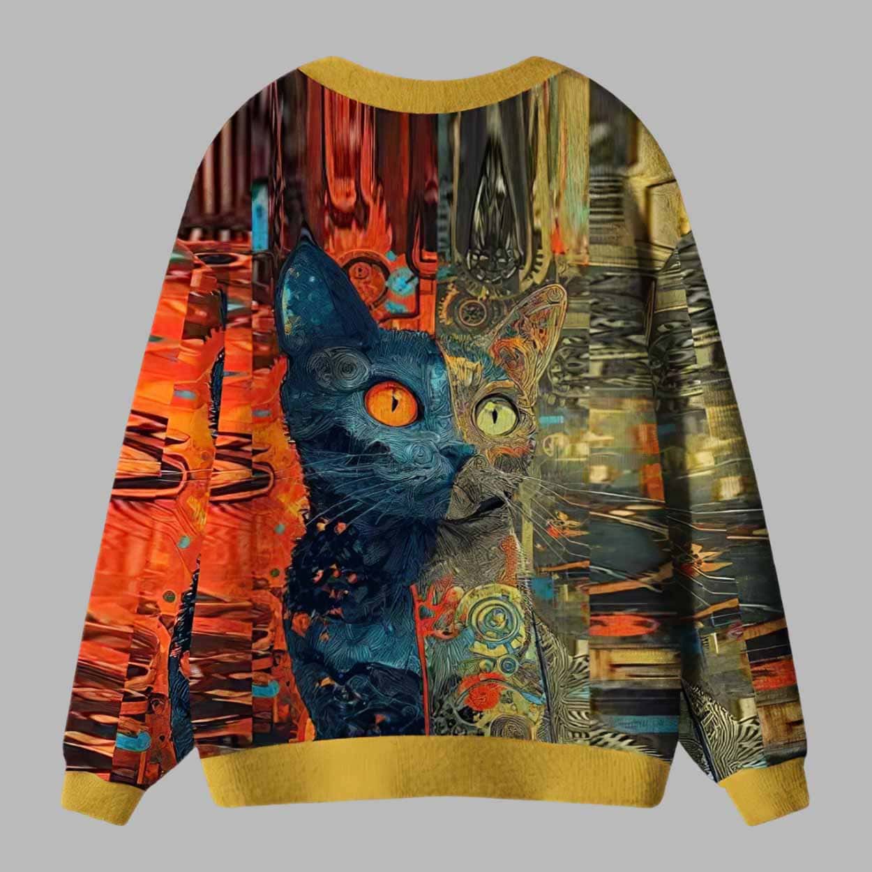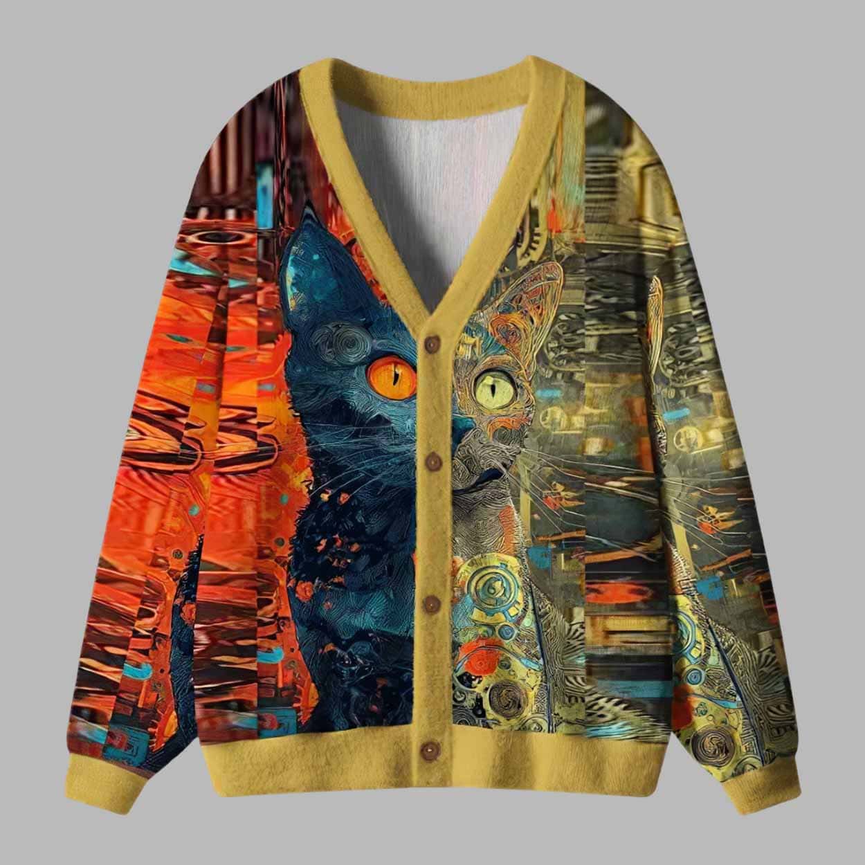 The ugly cardigan sweater features a mesmerizing design of a steampunk-inspired cat with vivid orange and teal tones set against a glowing industrial backdrop. Its hypnotic gaze, mechanical textures, and abstract artistry make it a wearable masterpiece that bridges the worlds of fantasy and modern fashion. The design wraps seamlessly across the entire cardigan, creating a full-coverage print that’s eye-catching from every angle.