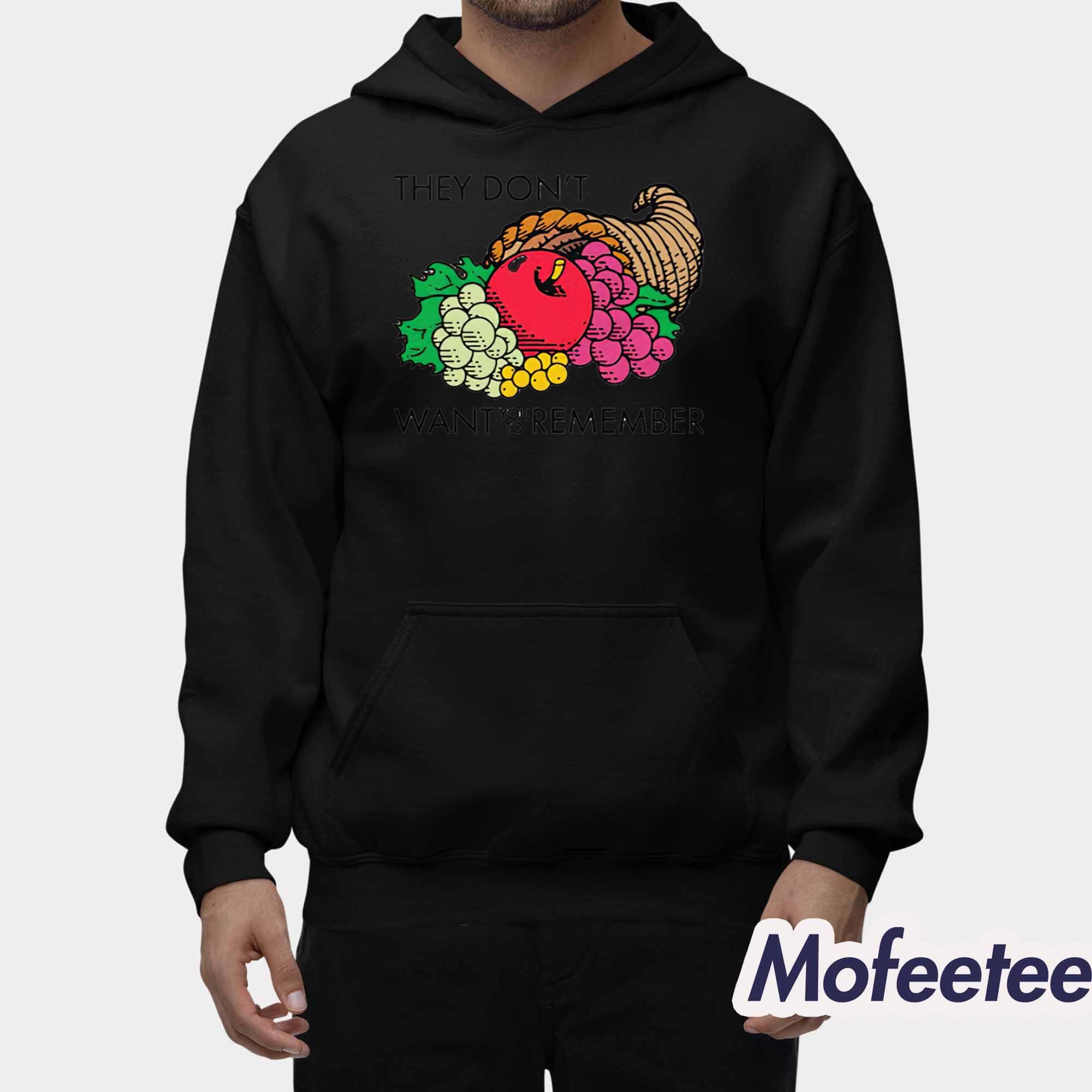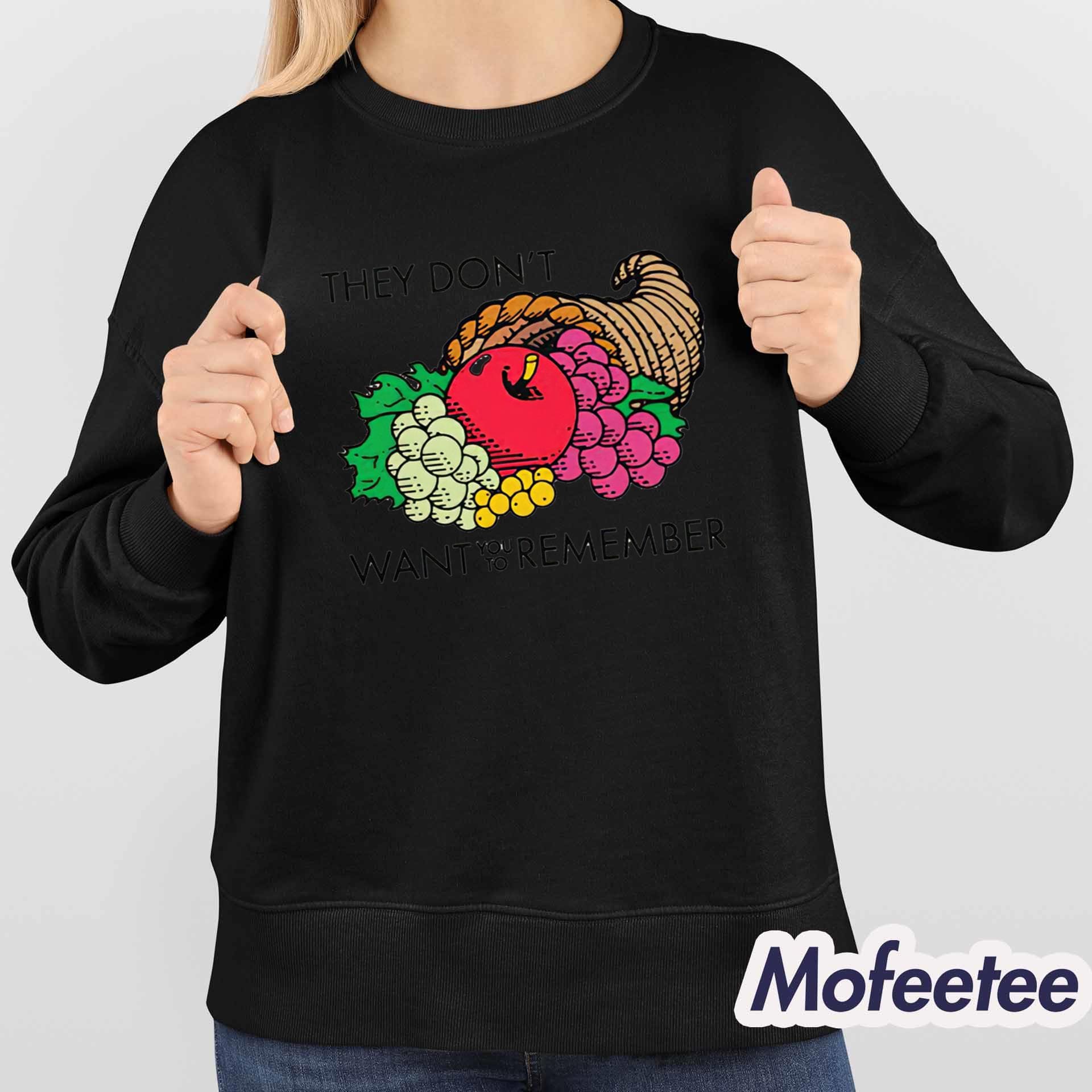 The shirt features a vivid cornucopia graphic symbolizing abundance and harvest, contrasted with the bold phrase “They Don’t Want You To Remember.” The design’s subtle yet impactful tone encourages curiosity and conversation, making it ideal for anyone who appreciates meaningful fashion.