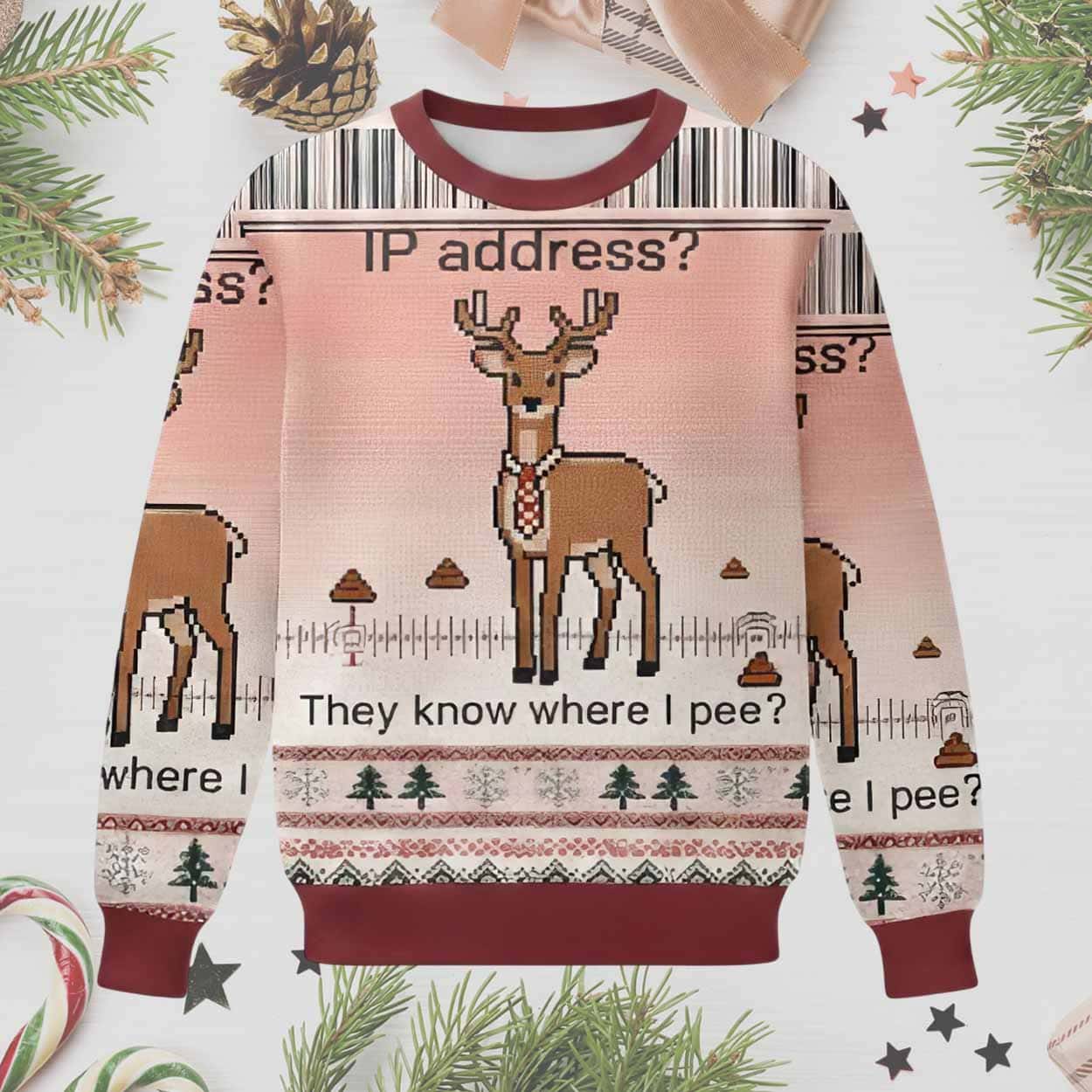 The They Know Where I Pee Ugly Christmas Sweater is the perfect mix of humor, tech jokes, and festive style. Featuring a pixelated reindeer, quirky “IP address?” text, and the hilarious caption “They know where I pee?”, this sweater adds a playful twist to your holiday wardrobe. Whether you’re heading to an ugly sweater party or simply want to stand out this season, the ugly christmas sweater delivers comfort, warmth, and unforgettable meme-level humor.
