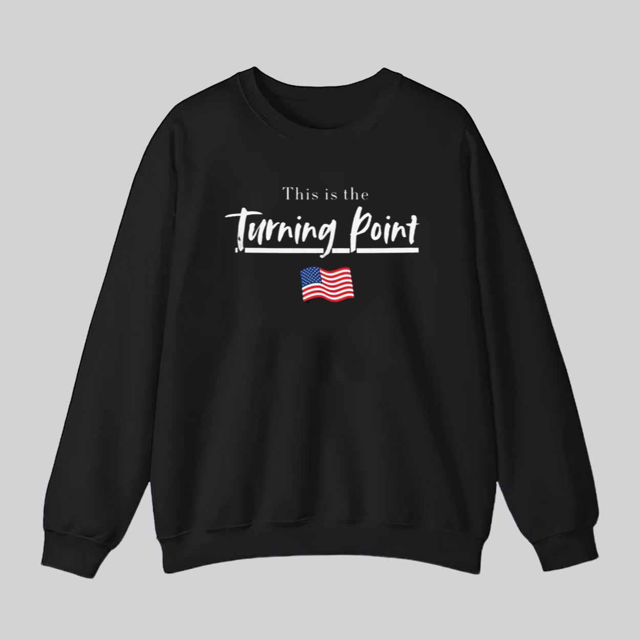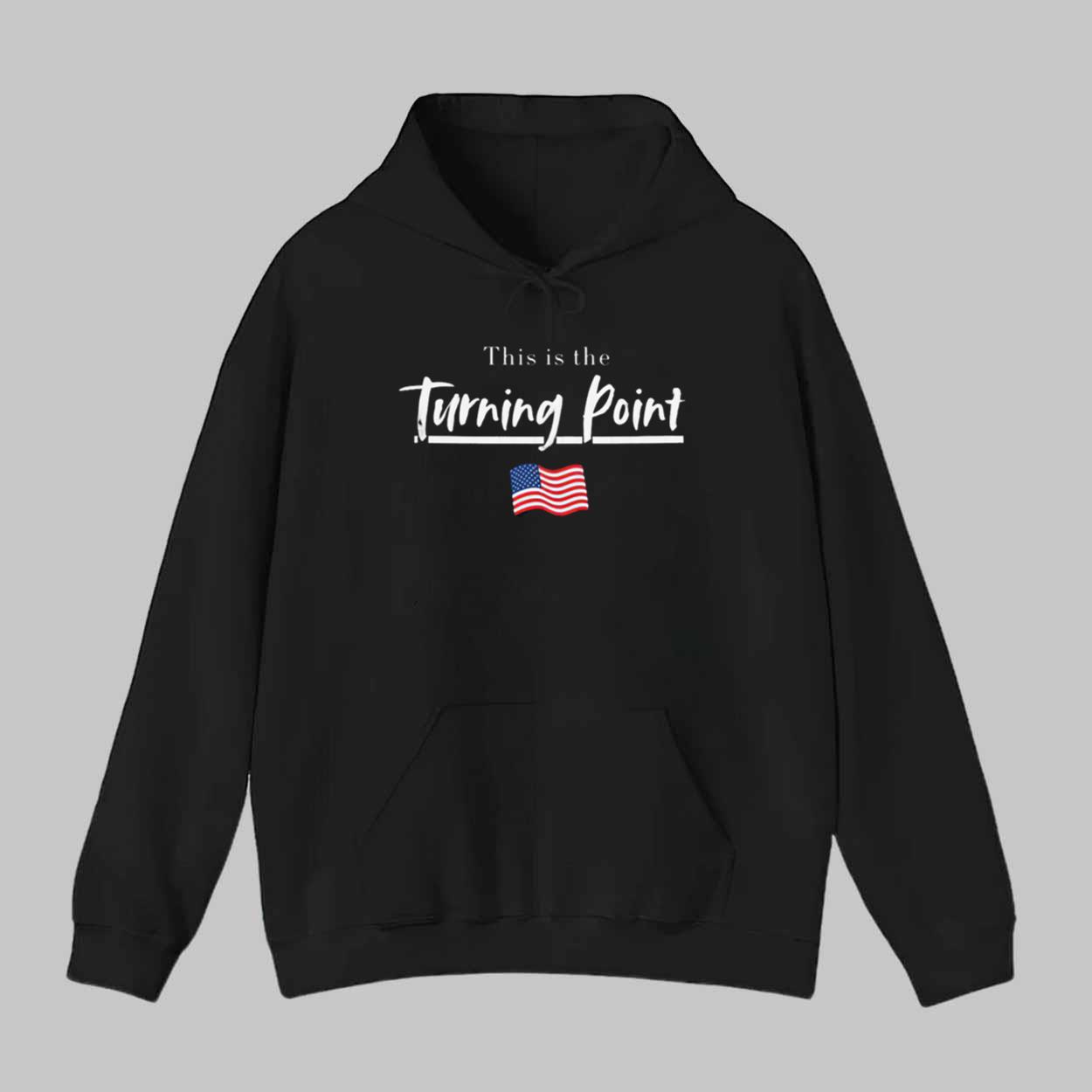The breathable fabric is soft on the skin, making it perfect for everyday wear, whether you’re at a rally, running errands, or relaxing at home. The classic black background highlights the clean white script that reads “This Is The Turning Point”, accompanied by a red, white, and blue American flag.