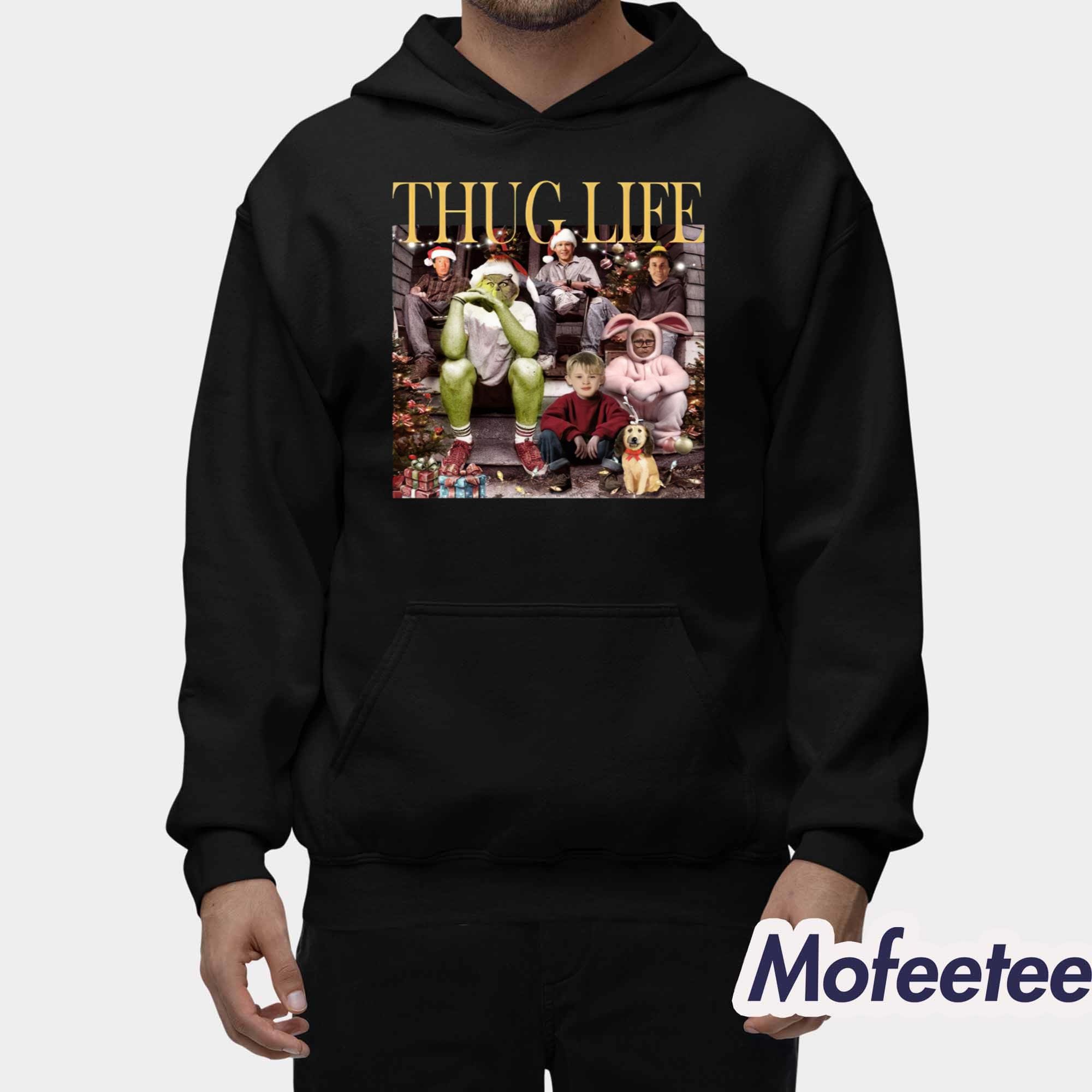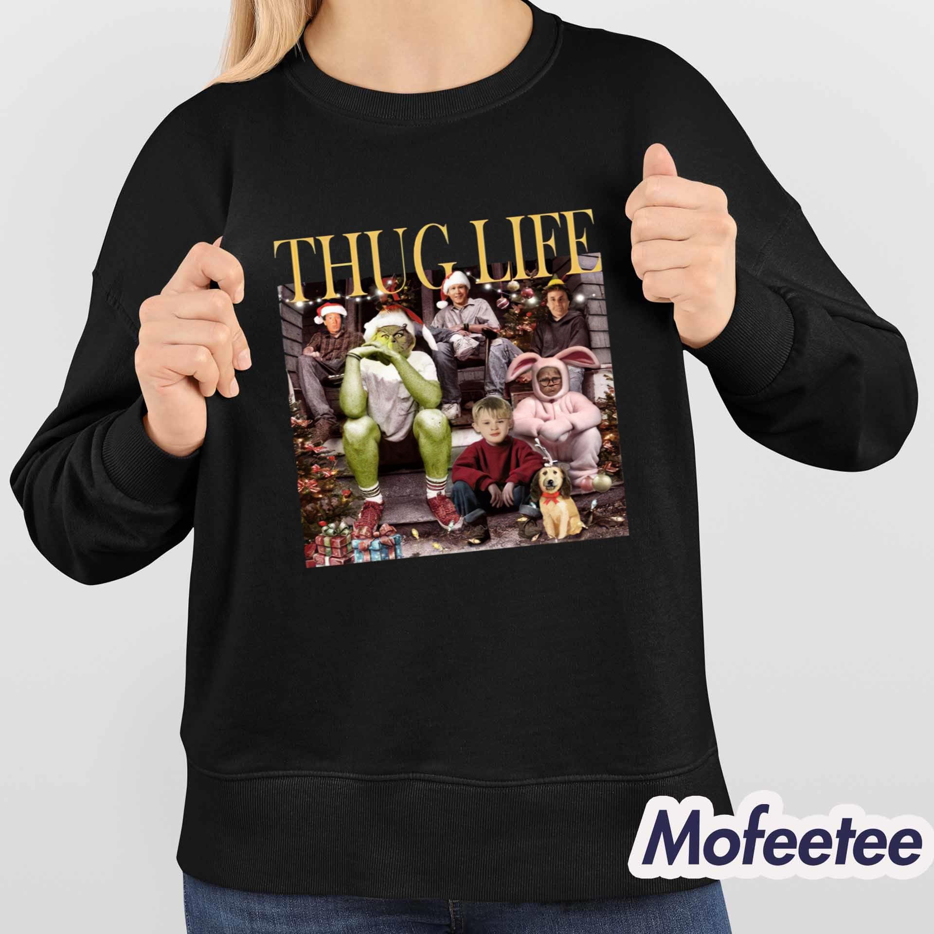 The shirt features a vibrant graphic print showcasing the Grinch in a casual, rebellious pose, surrounded by other beloved Christmas characters like Kevin, Buddy, and even the family dog. The “Thug Life” text adds an extra layer of humor and style to this fun holiday design.