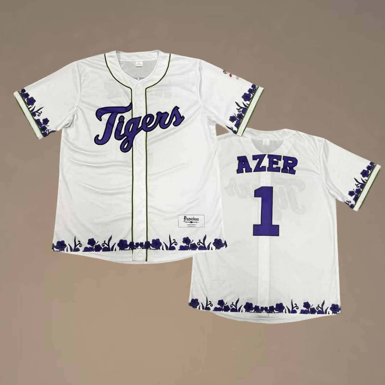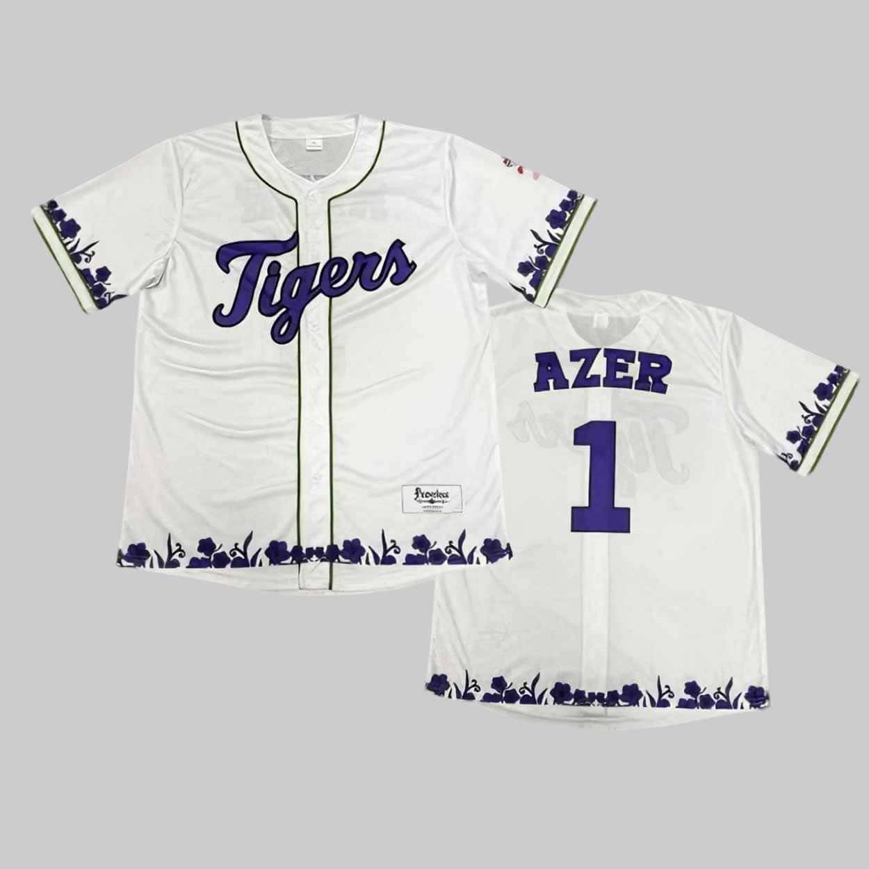 The jersey 2025 giveaway features a striking white base with intricate purple flower detailing along the hem, making this jersey both eye-catching and elegant. The bold “Tigers” print on the front, paired with the “AZER” name and “1” on the back, gives it a sporty, custom feel. The flower accents add a touch of charm, creating a unique contrast with the vibrant and sporty look of the jersey.