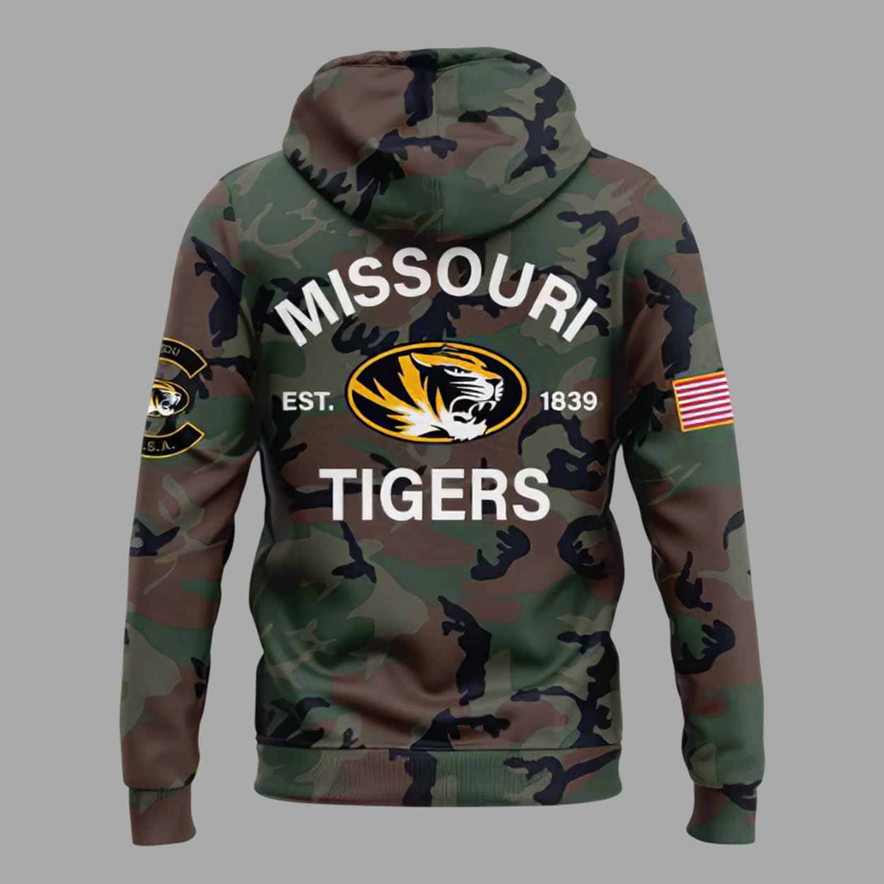 This hoodie features a striking full-camo print that instantly gives it a tough, rugged, military-inspired look. On the front, large MIZZOU Football lettering pairs with the Tigers logo to proudly display team loyalty. The back highlights MISSOURI TIGERS with the year EST. 1839, giving it a heritage touch. Military patches on the sleeves, including the U.S. flag, elevate the appreciation theme and bring authenticity to the design.