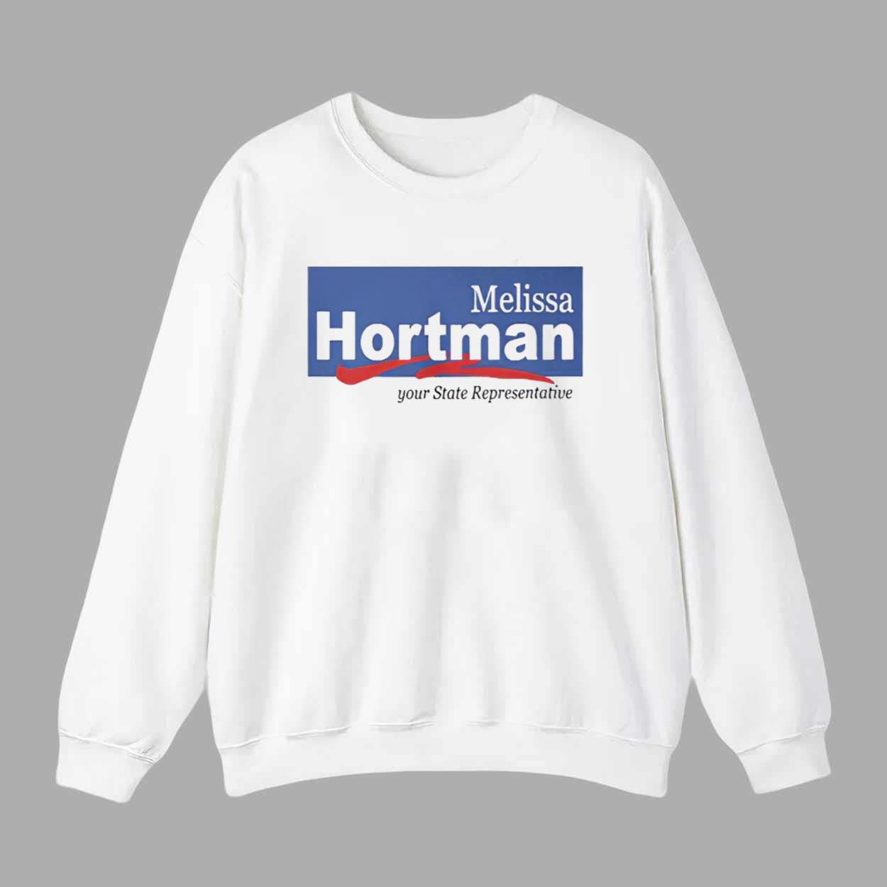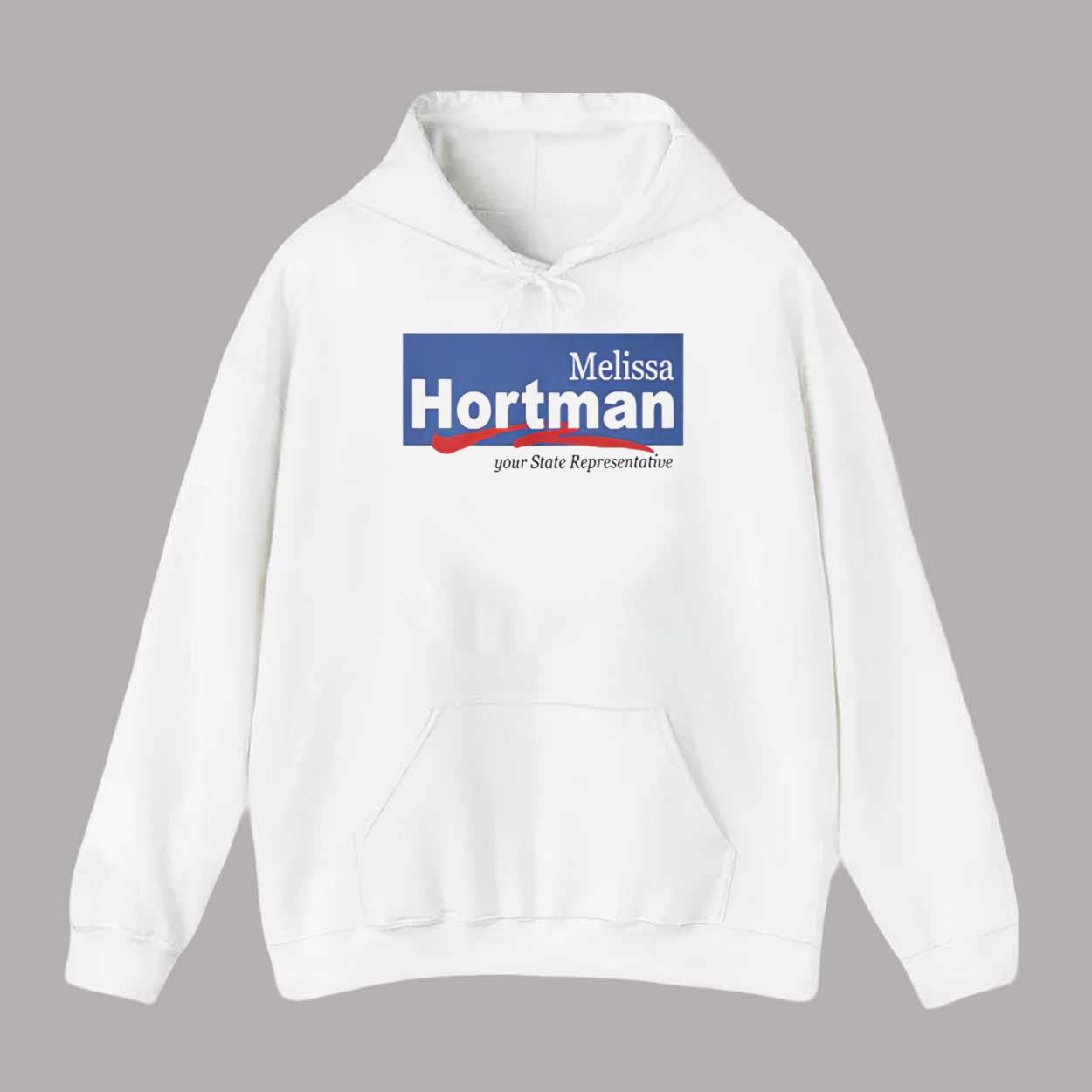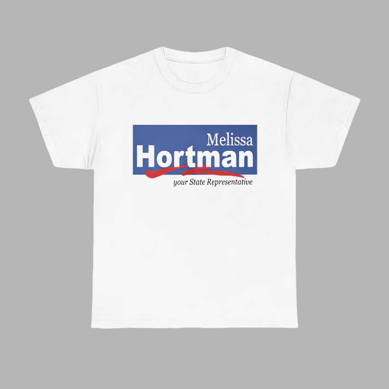 The shirt features a classic campaign design, combining a vibrant blue background, bold white text, and a dynamic red underline beneath “Hortman” to convey energy and commitment. The phrase “your State Representative” rests below in an elegant serif font, adding a formal touch to the otherwise modern look. The design is printed on a crisp white t-shirt, ensuring the graphic pops with visual clarity.