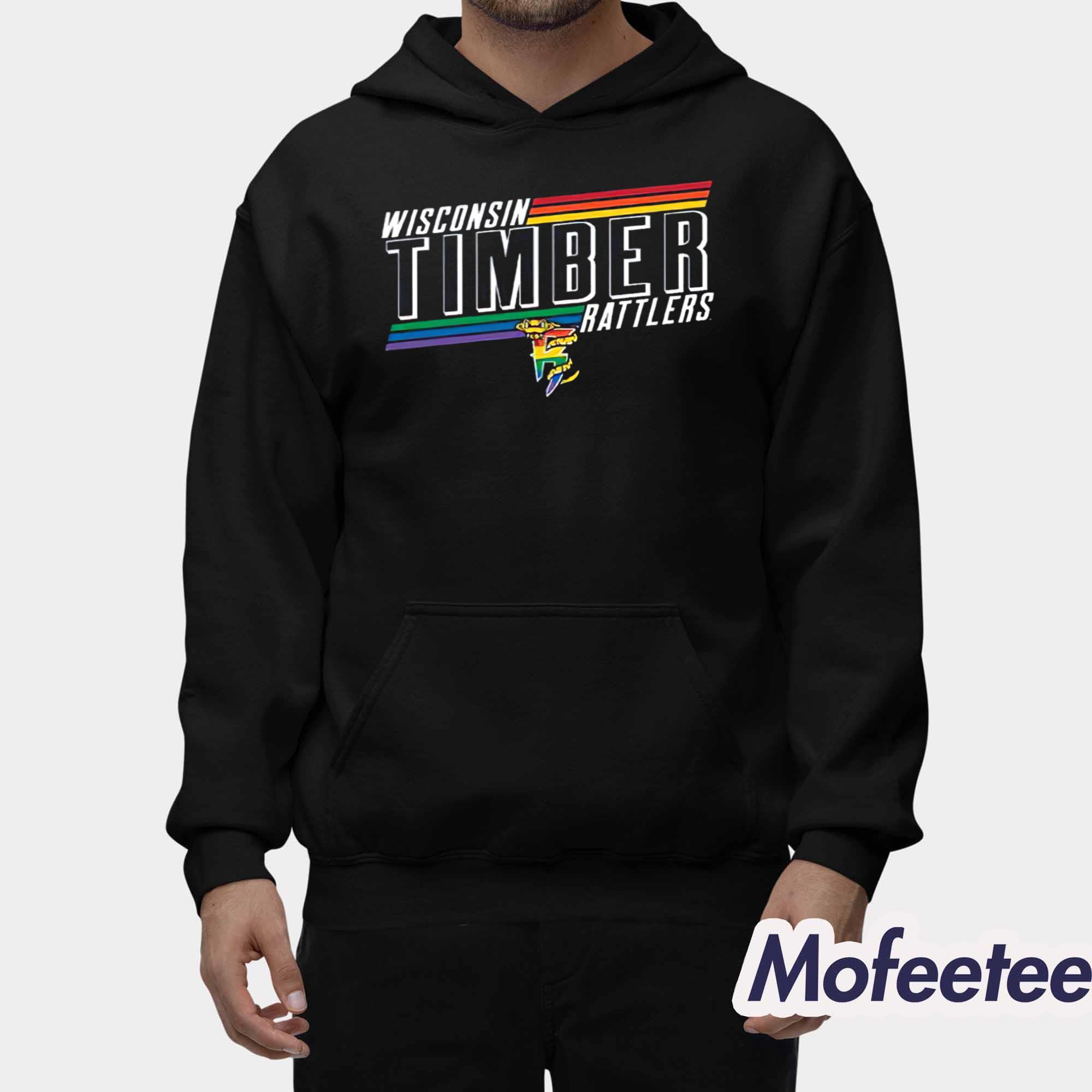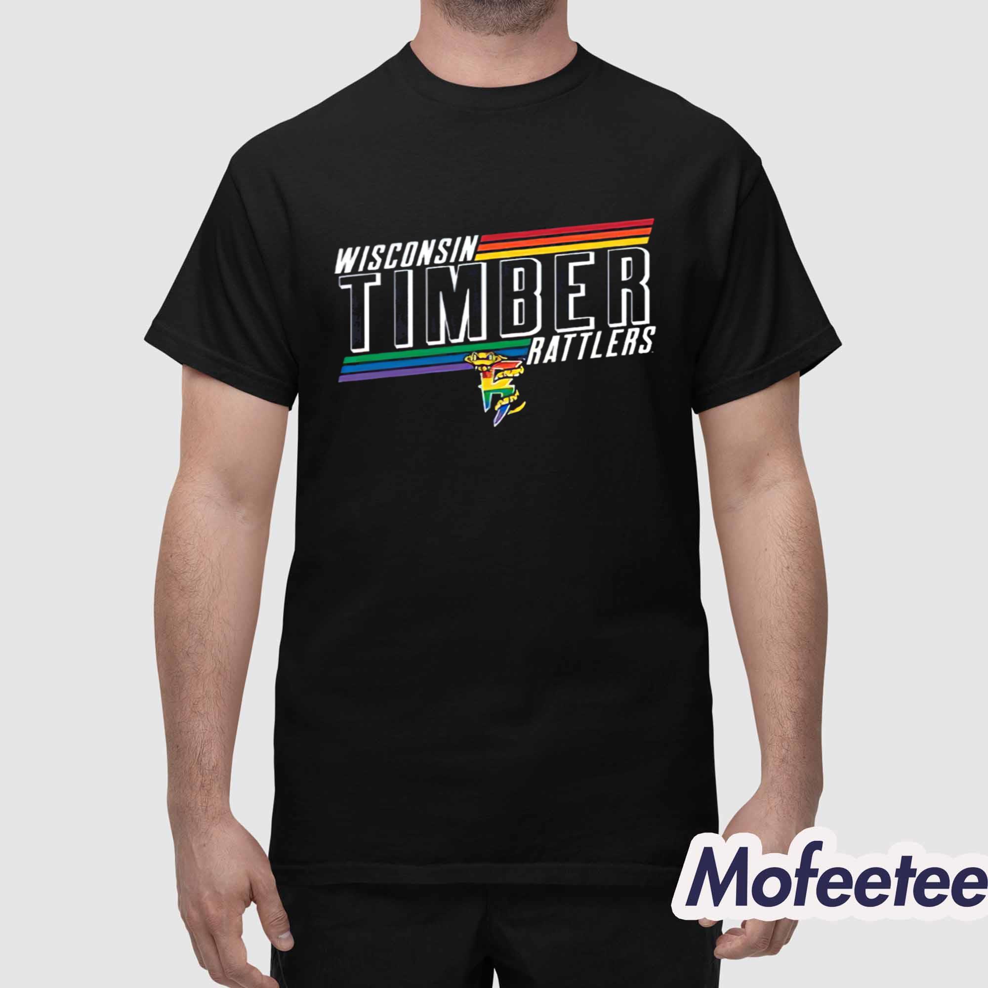 This eye-catching design showcases the Wisconsin Timber Rattlers team name across the chest, accented with the colors of the rainbow flag sweeping boldly through the typography. A stylized Timber Rattler logo appears in a Pride color palette—adding a unique twist to the team’s traditional branding. It’s a striking design that sends a message of unity, pride, and team spirit.