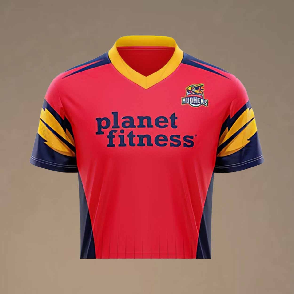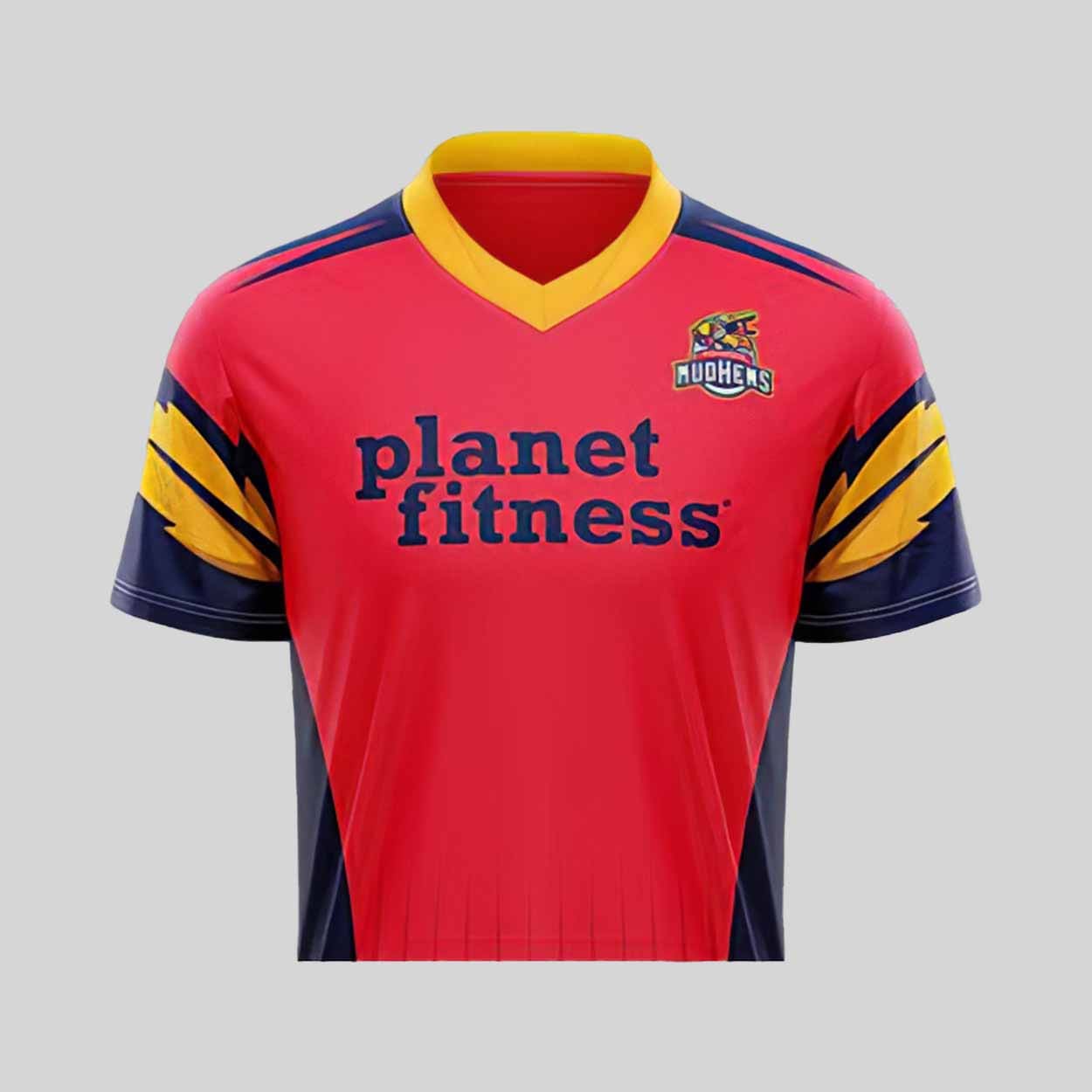 The jersey 2025 giveaway features a bold red base accented with deep navy and bright yellow on the sleeves and collar. The angular sleeve detailing and color-blocked side panels add a modern, sporty edge. The front proudly showcases the official “Planet Fitness” sponsor logo and the Mud Hens crest over the heart—making it feel like a true professional soccer jersey.
