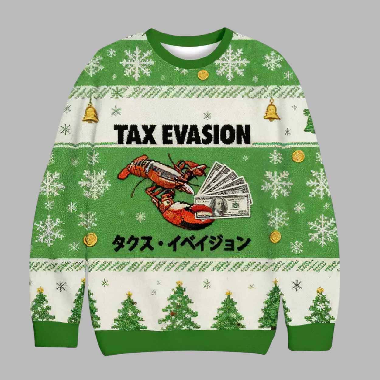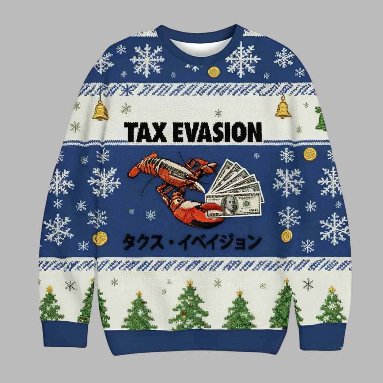 The design features the phrase “TAX EVASION” in bold letters across the chest, complemented by a playful illustration of a lobster holding money. The inclusion of Japanese text (タックス・イベイジョン) adds an extra layer of creativity and uniqueness to the design, making this sweater a fun conversation starter. The sweater’s red and white color scheme, along with festive snowflakes, bells, and Christmas trees, gives it a traditional holiday sweater feel, with a humorous and unexpected twist.