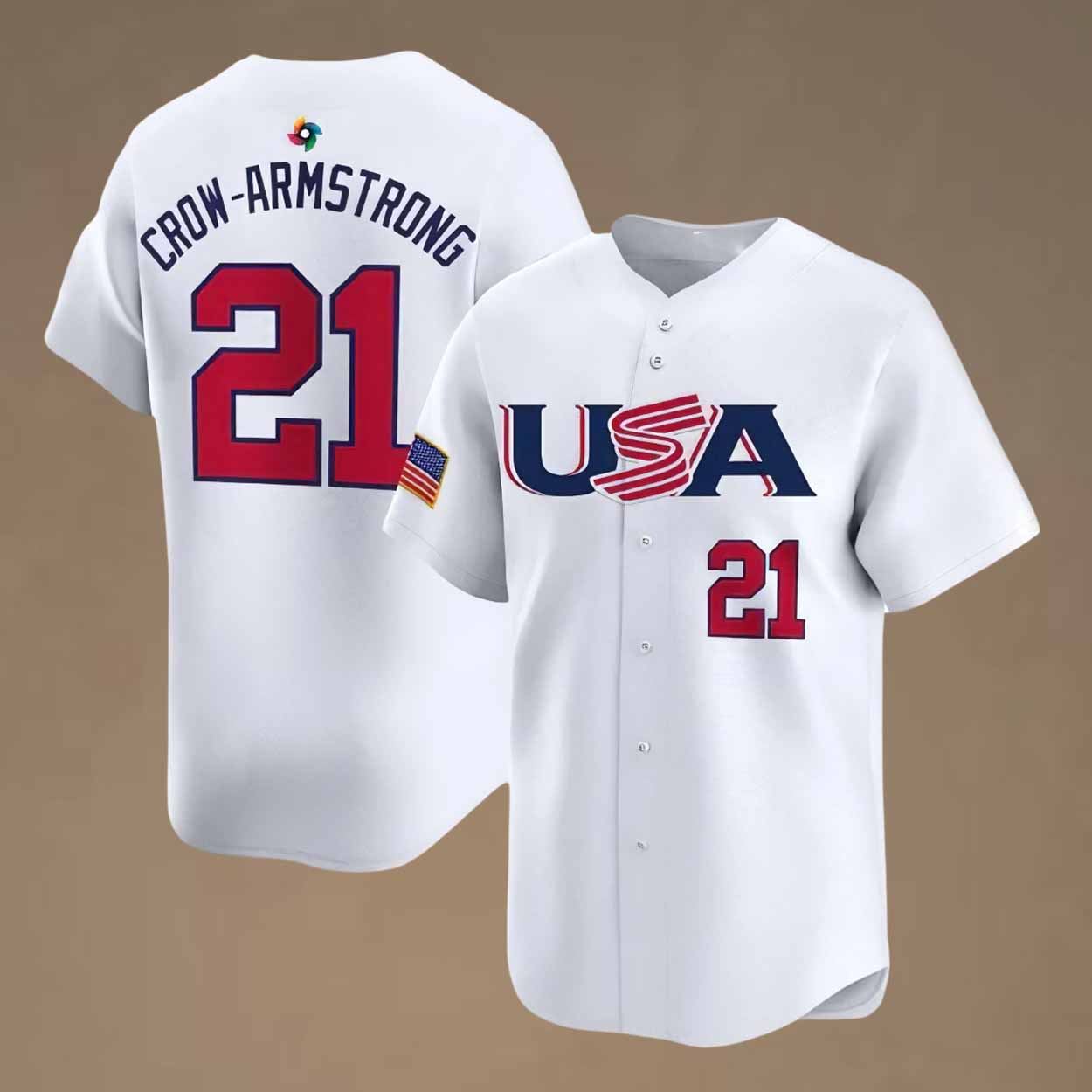The front proudly displays the bold “USA” wordmark with patriotic styling, combining navy and red with an American flag-inspired stripe. The number 21 appears on both the front and back, honoring Crow-Armstrong’s identity on the national stage. The back features his full name in crisp lettering, giving the jersey a true competitive team feel. An embroidered American flag patch on the sleeve enhances the jersey’s iconic look, celebrating international competition and national unity.
