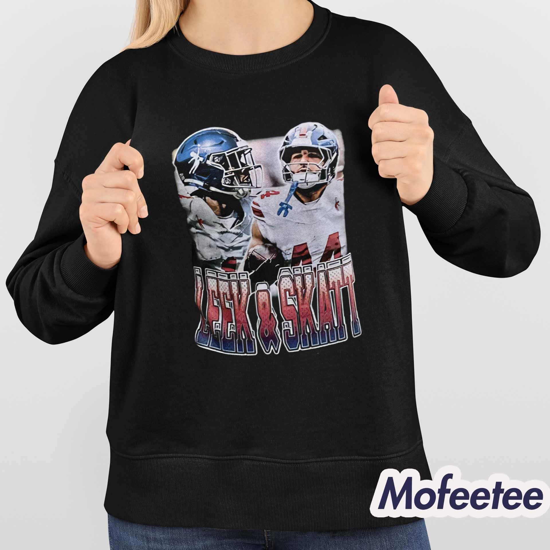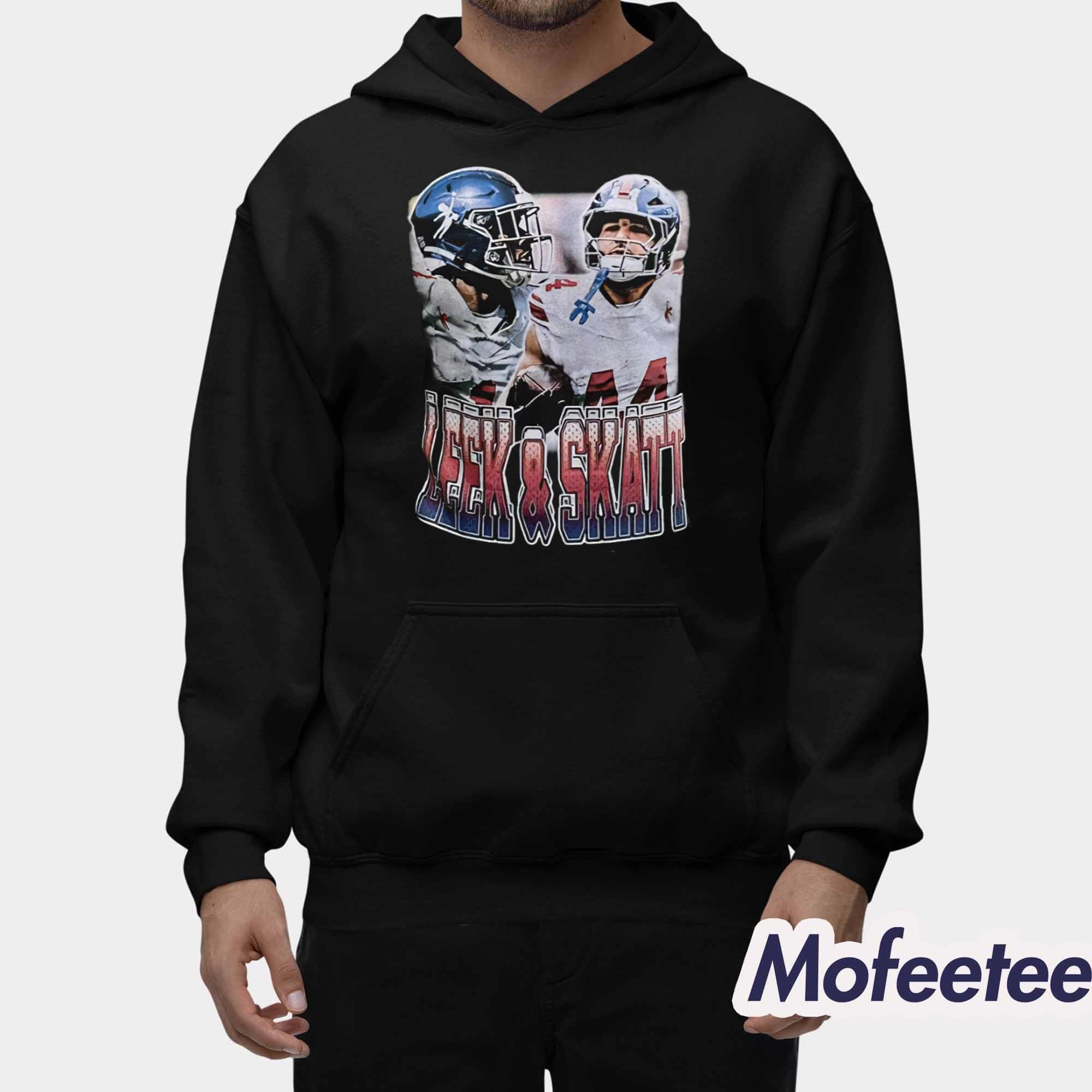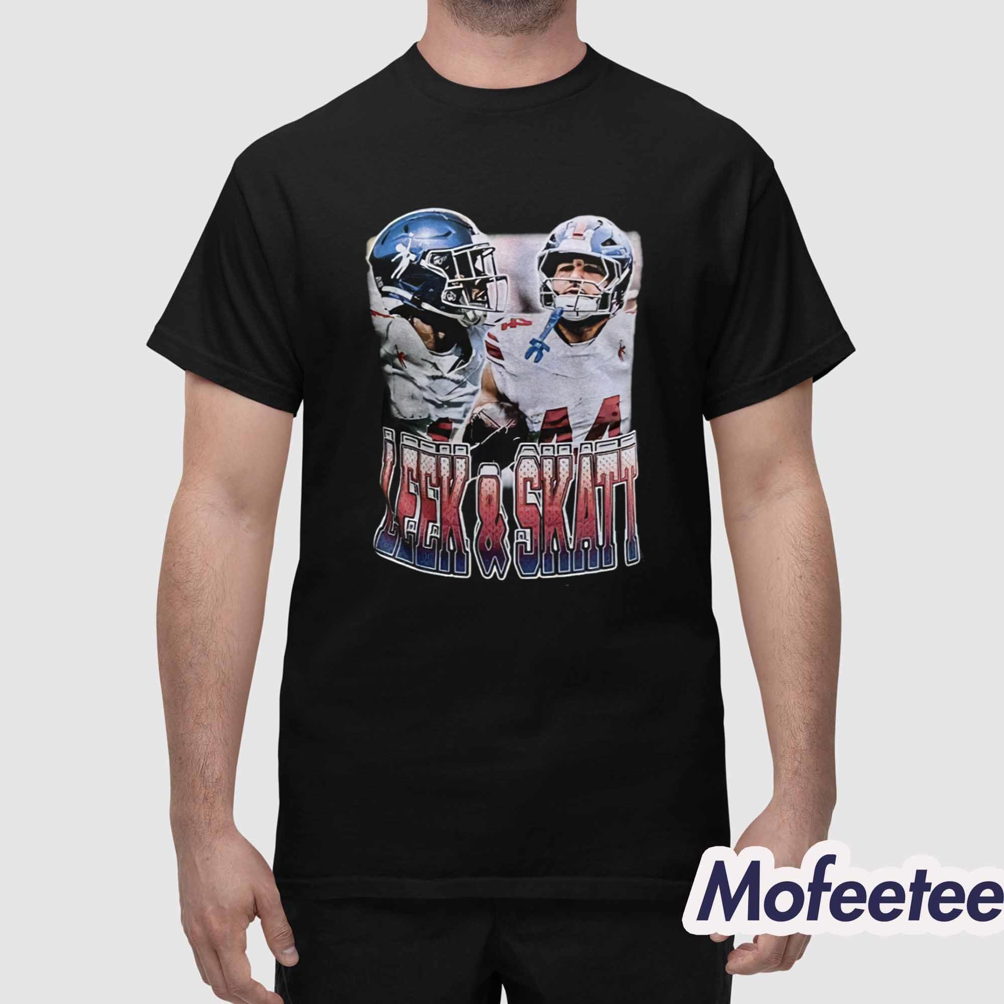 The shirt blends bold design with undeniable football passion. The graphic features two powerful action shots of the players, framed with striking text that reads “Leek & Skatt” in patriotic red, white, and blue tones. It’s a tribute to teamwork, dedication, and athletic excellence — a look that turns heads whether you’re at the stadium, sports bar, or watching from home.