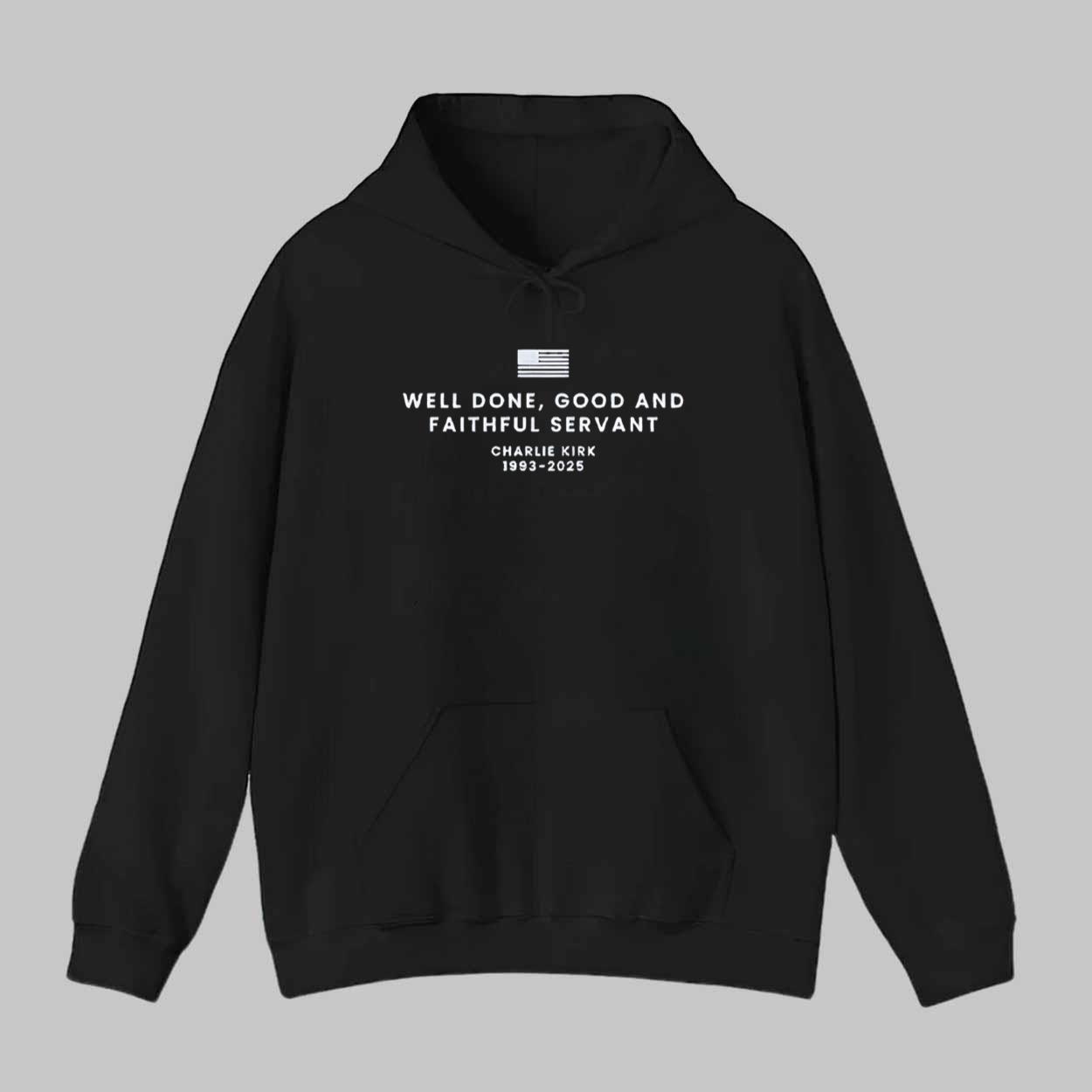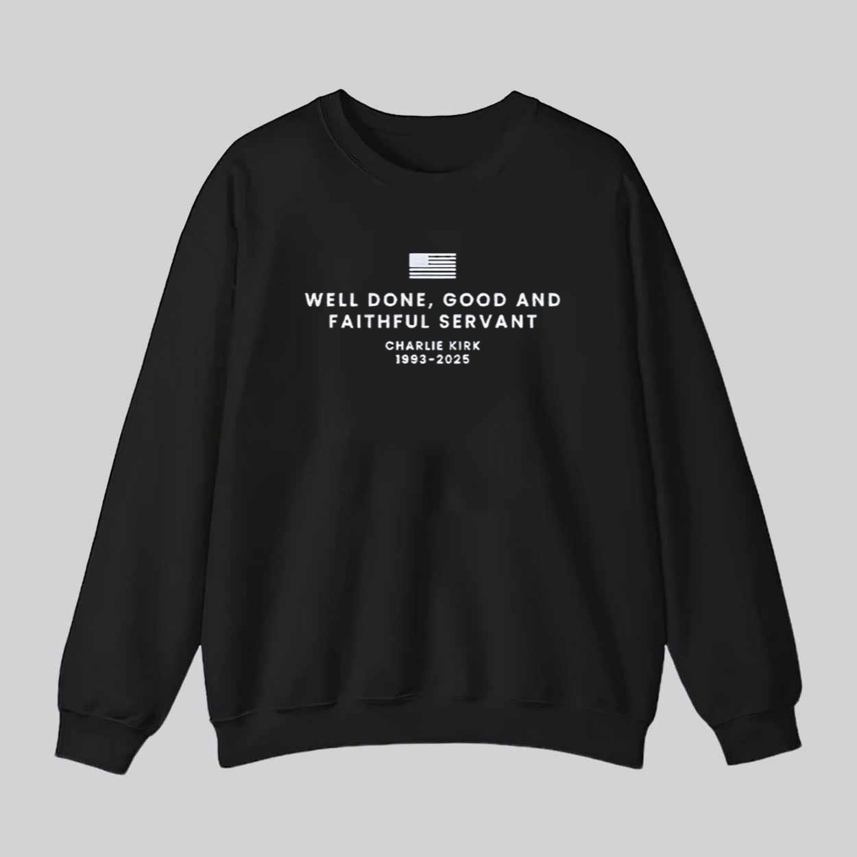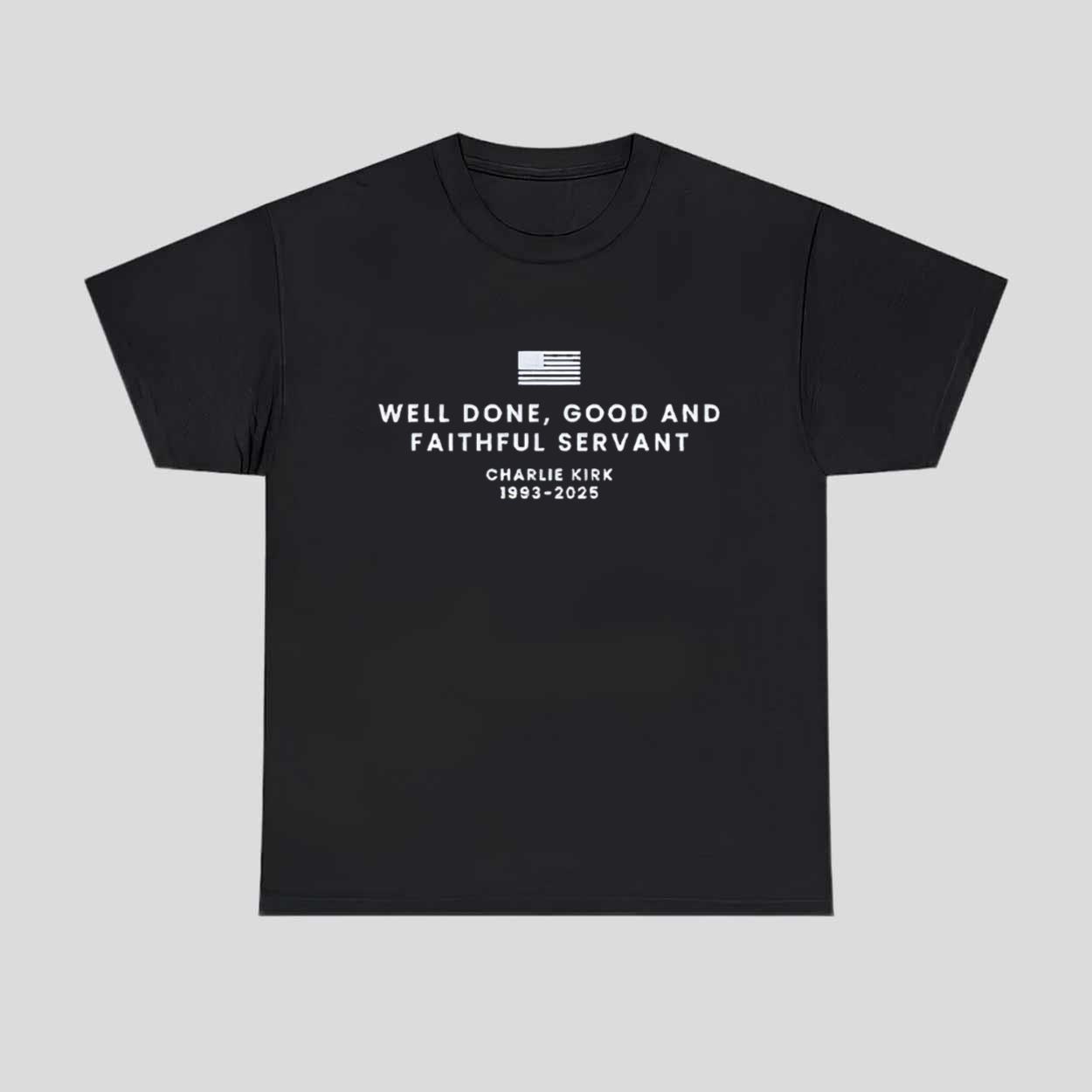 The design is simple yet powerful, with a clean and bold font that conveys the message clearly. The front of the shirt features the quote, “Well Done, Good and Faithful Servant,” accompanied by a graphic of the American flag, while the back displays the name Charlie Kirk with the years 1993-2025, a true reflection of the person’s dedication and influence.