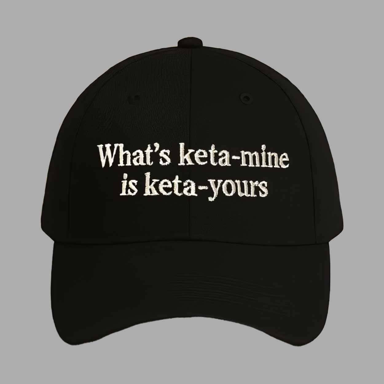 The bold text “What’s ketamine is keta yours” on the front adds a quirky and humorous element to the classic baseball cap. The white embroidery pops against the black background, making the message clear and attention-grabbing. This hat is ideal for anyone who loves to express their unique sense of humor and style.