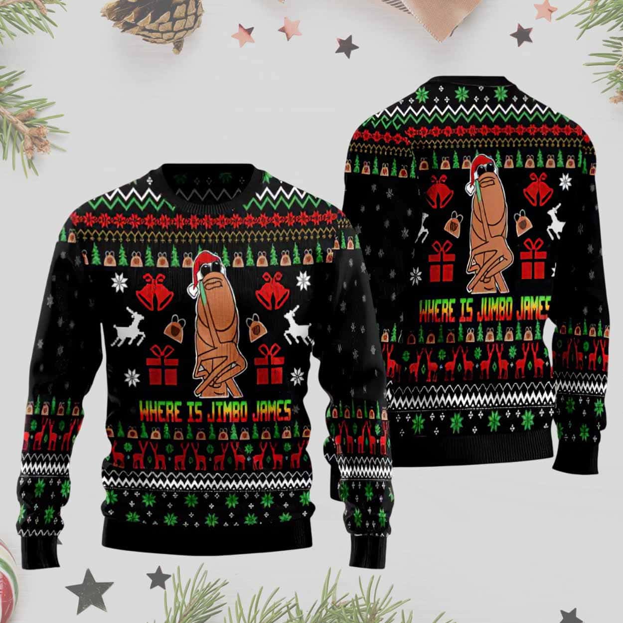 The front features the question “Where Is Jimbo James” paired with a festive cartoon-style character wearing a Santa hat, surrounded by classic holiday icons like reindeer, gifts, and snowflakes. The combination of red, black, green, and white patterns gives it that classic Christmas sweater aesthetic, while the bold humor makes it a total standout.