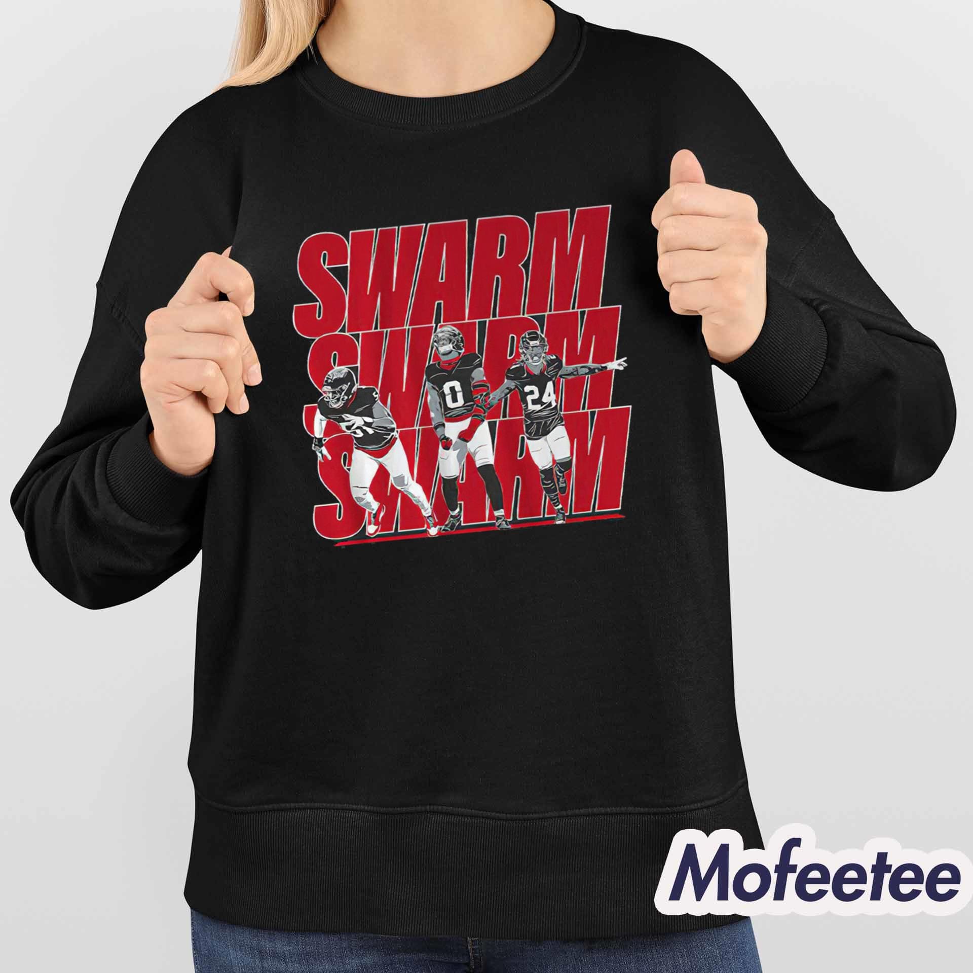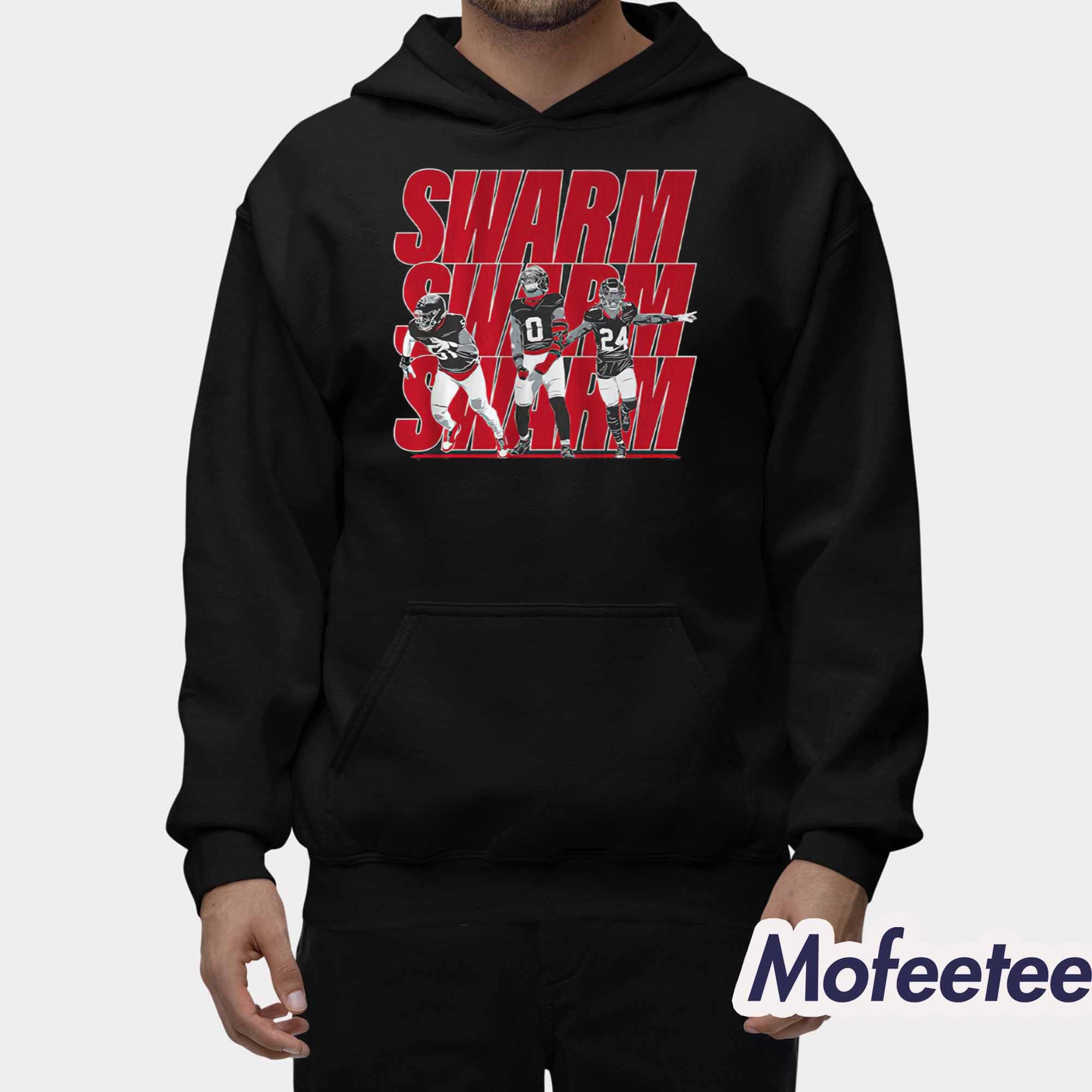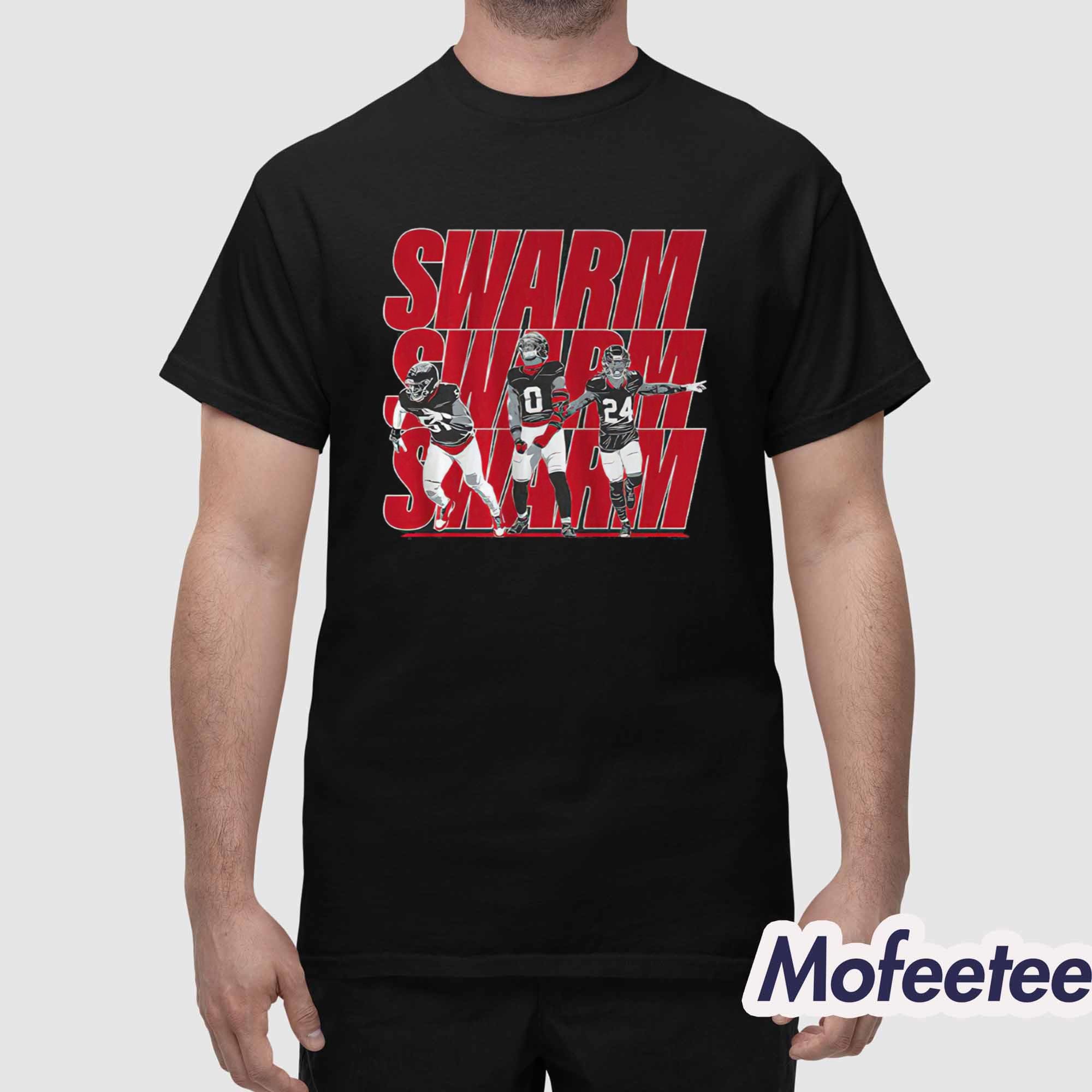 At the center of the design, the shirt showcases Will Anderson Jr, Azeez Al-Shaair, and Derek Stingley Jr in an action-packed layout, backed by a striking red “SWARM” typography repeated across the chest. The artwork pops beautifully against the shirt’s solid background, making it visually sharp while clearly representing fan passion.
