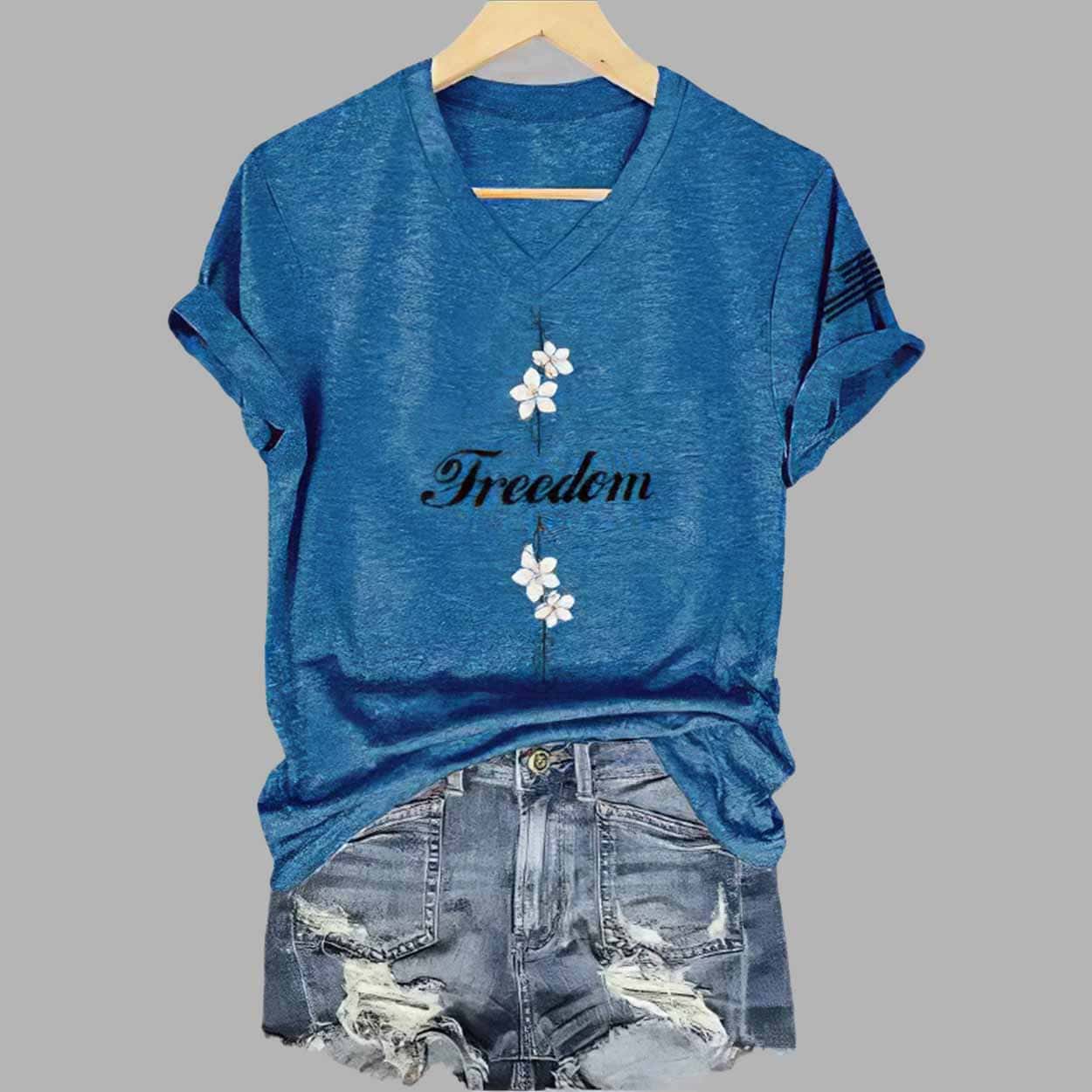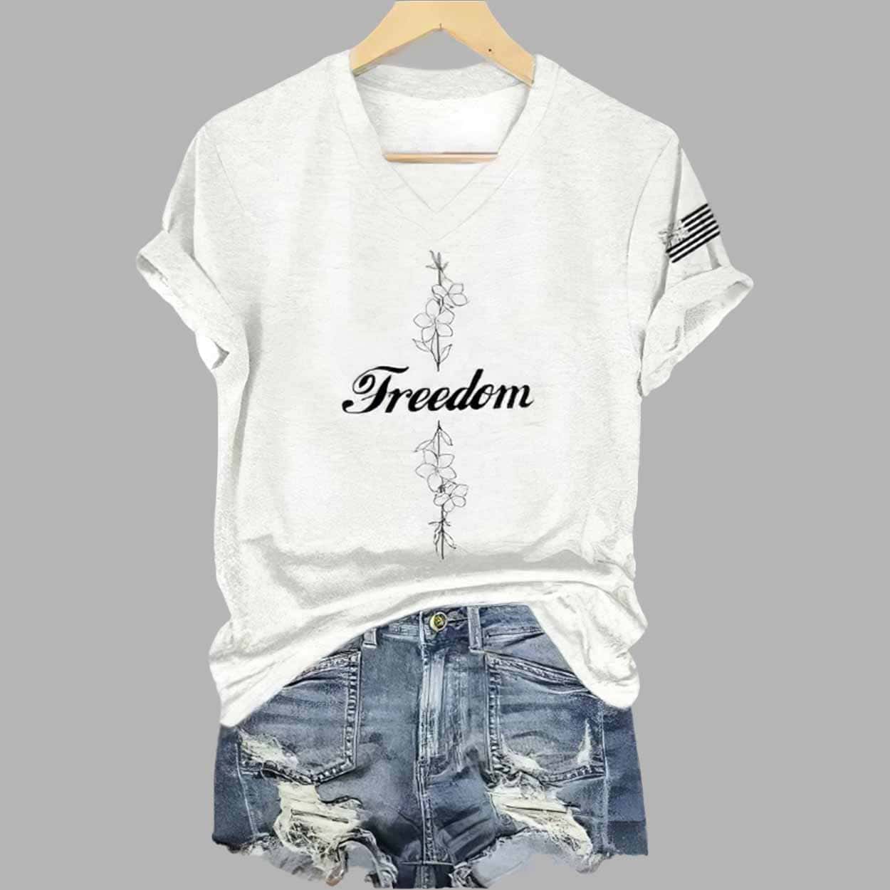 A Blend of Style Comfort and Meaning Women’s Freedom Commemorative Print V Neck Shirt