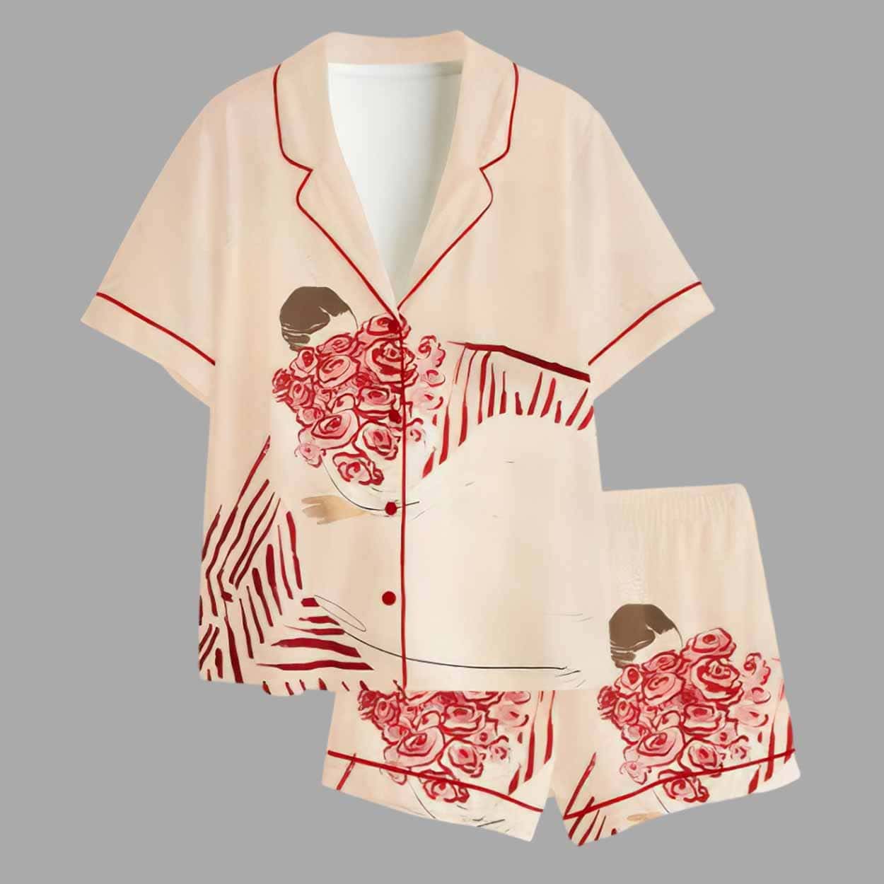 This charming pajama set features a button-down short-sleeve top and matching shorts, both decorated with an artistic illustration of a woman holding a bouquet of blooming red and pink flowers. The soft beige base color, paired with red piping and thoughtful brushstroke details, creates a dreamy, romantic aesthetic perfect for Valentine’s Day or any night you want to feel beautifully relaxed.